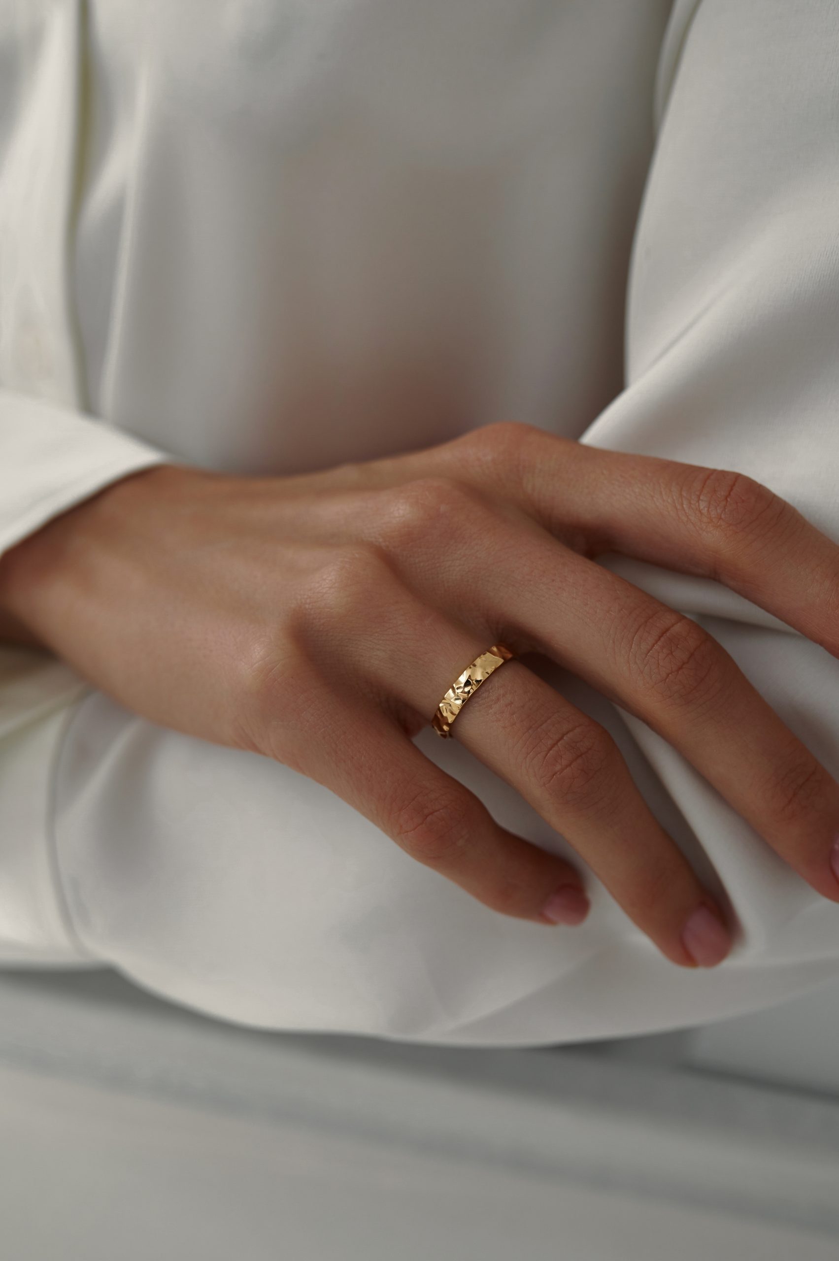 Обручальное кольцо с ямчатой фактурой вдохновлено формами природы — его поверхность напоминает очертания гор и холмов. Неровный рельеф придаёт кольцу выразительный и живой характер. Такой дизайн подойдёт тем, кто ценит природную эстетику и нестандартные детали в классической форме.
