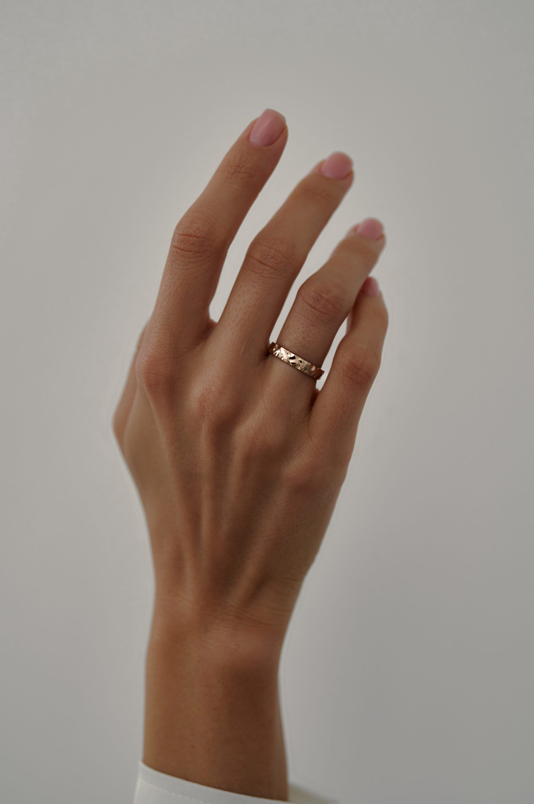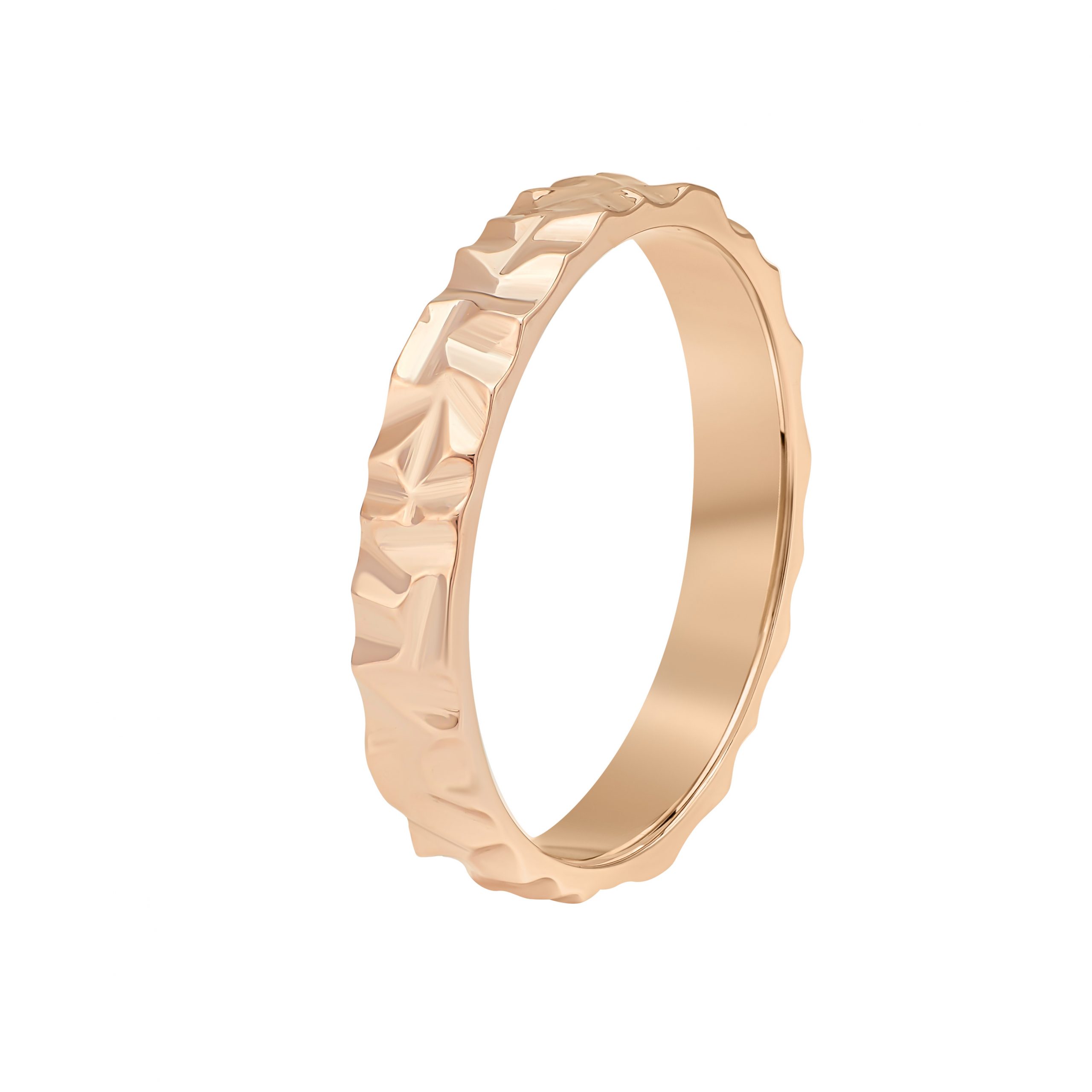 Обручальное кольцо с ямчатой фактурой вдохновлено формами природы — его поверхность напоминает очертания гор и холмов. Неровный рельеф придаёт кольцу выразительный и живой характер. Такой дизайн подойдёт тем, кто ценит природную эстетику и нестандартные детали в классической форме.