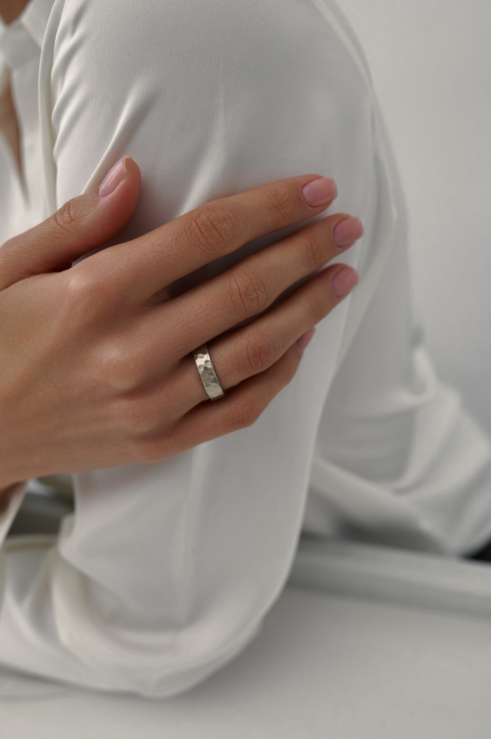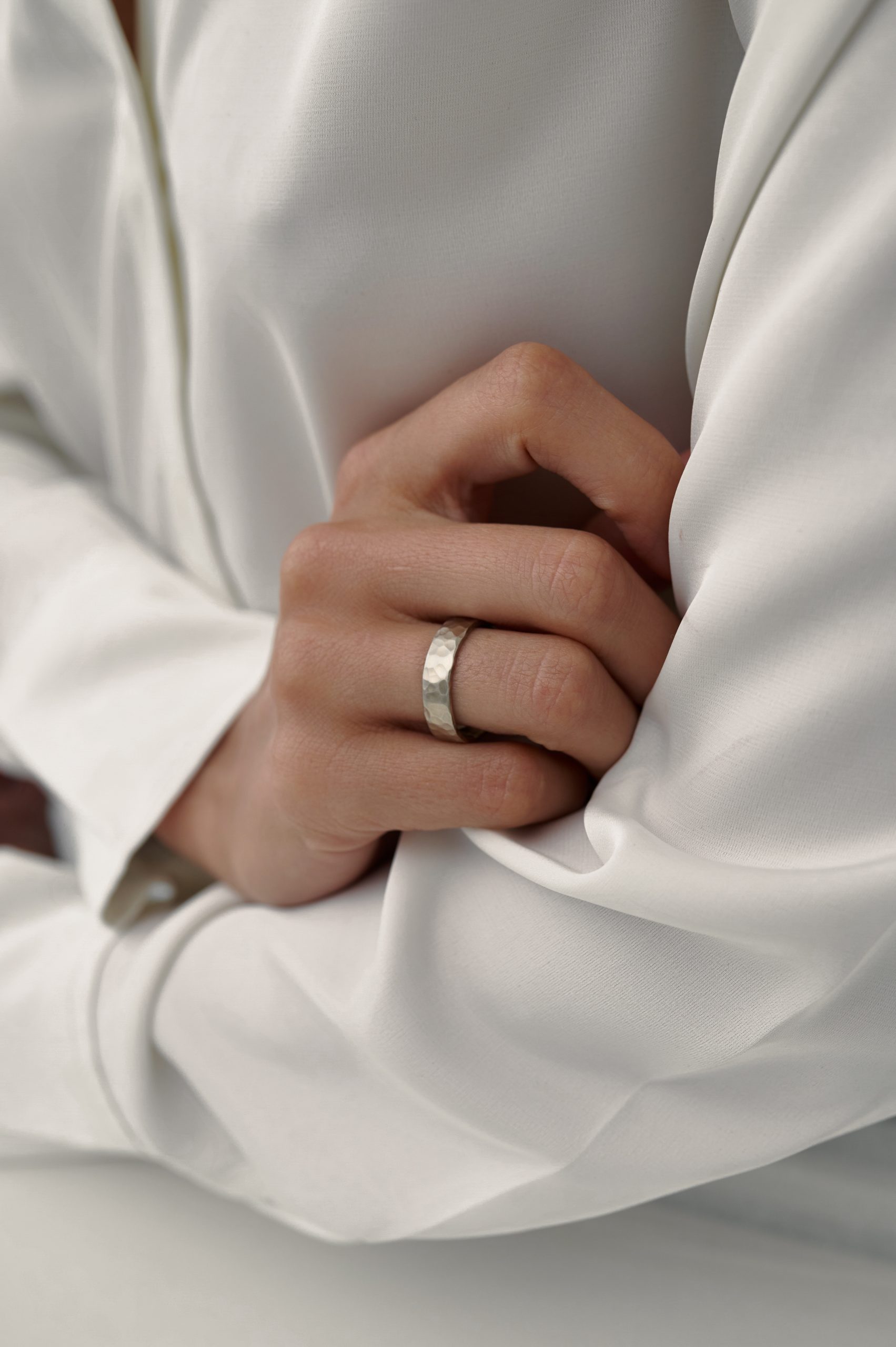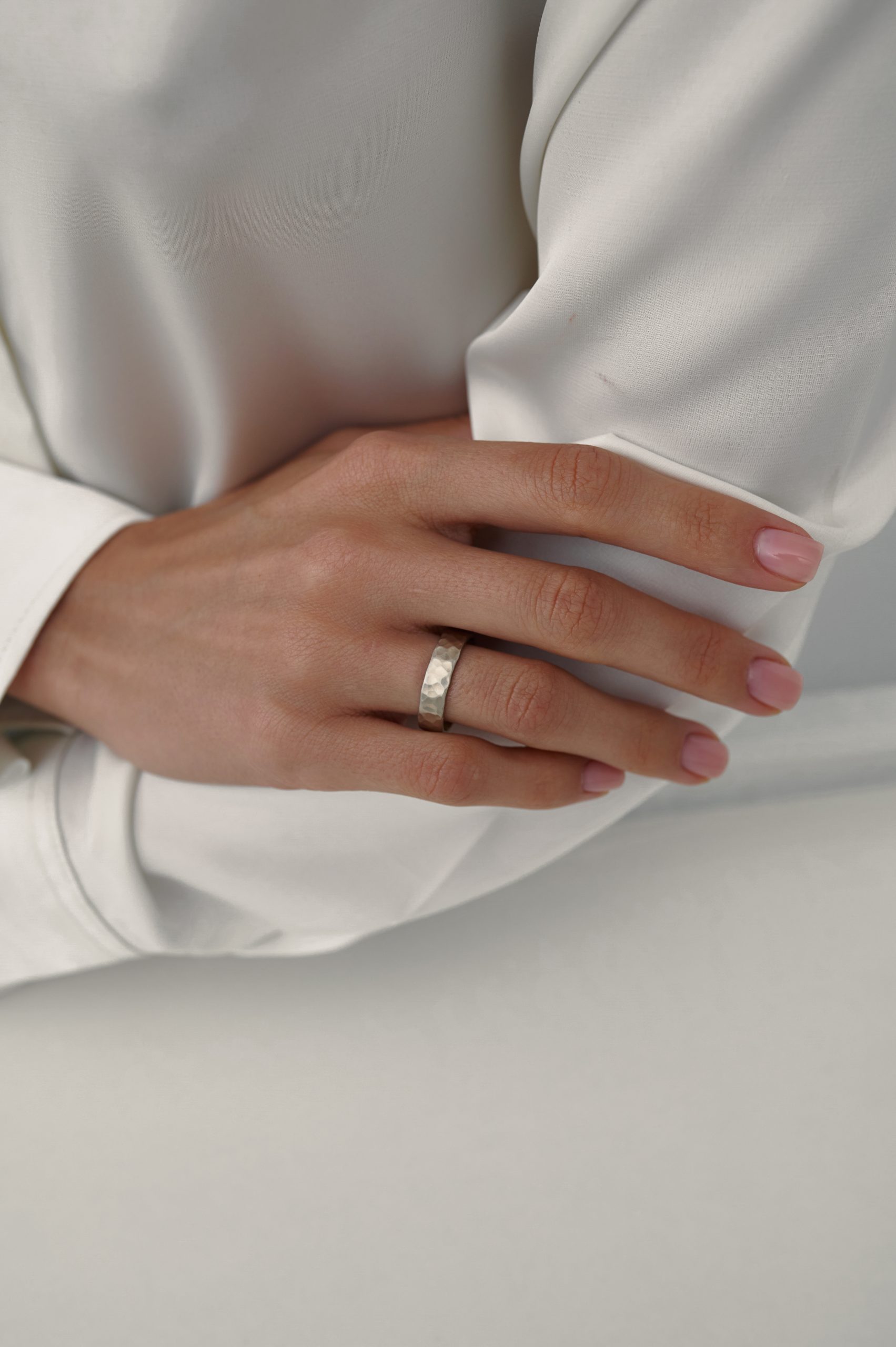 Обручальное кольцо с матовой лунной фактурой привлекает внимание своей необычной, рельефной поверхностью. Текстура напоминает лунный ландшафт — с легкими неровностями и глубиной, что делает каждое кольцо по-своему уникальным. Отсутствие родиевого покрытия сохраняет естественный оттенок металла, придавая украшению более живой и природный вид.