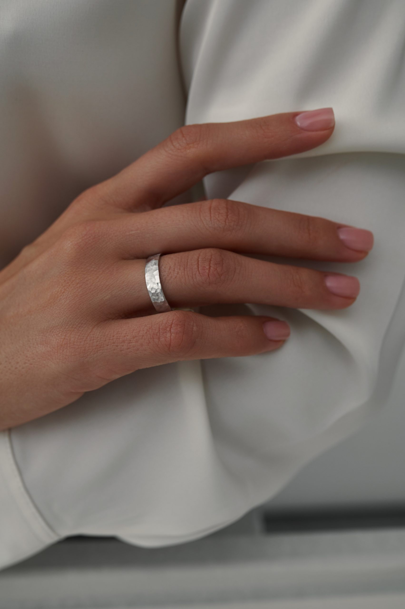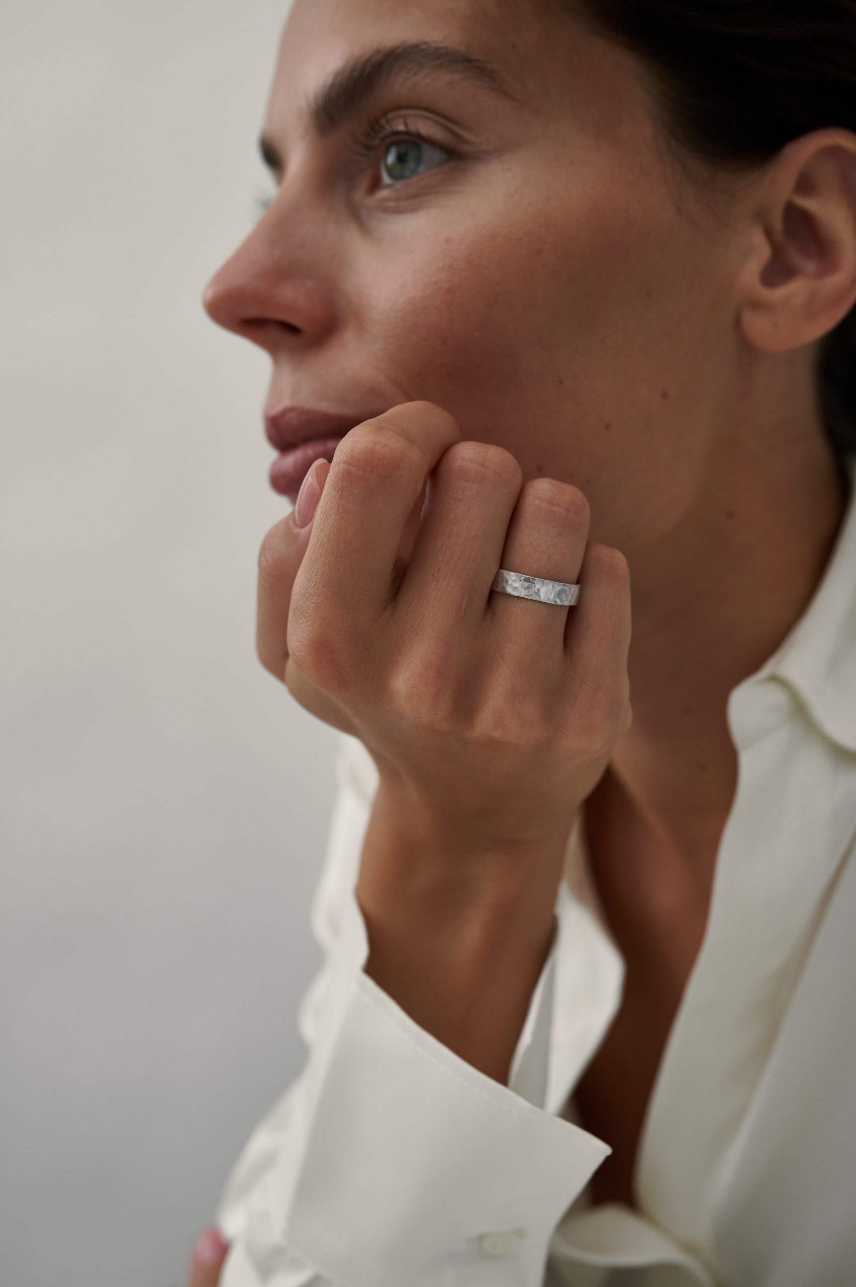 Обручальное кольцо с матовой лунной фактурой привлекает внимание своей необычной, рельефной поверхностью. Текстура напоминает лунный ландшафт — с легкими неровностями и глубиной, что делает каждое кольцо по-своему уникальным. Отсутствие родиевого покрытия сохраняет естественный оттенок металла, придавая украшению более живой и природный вид.
