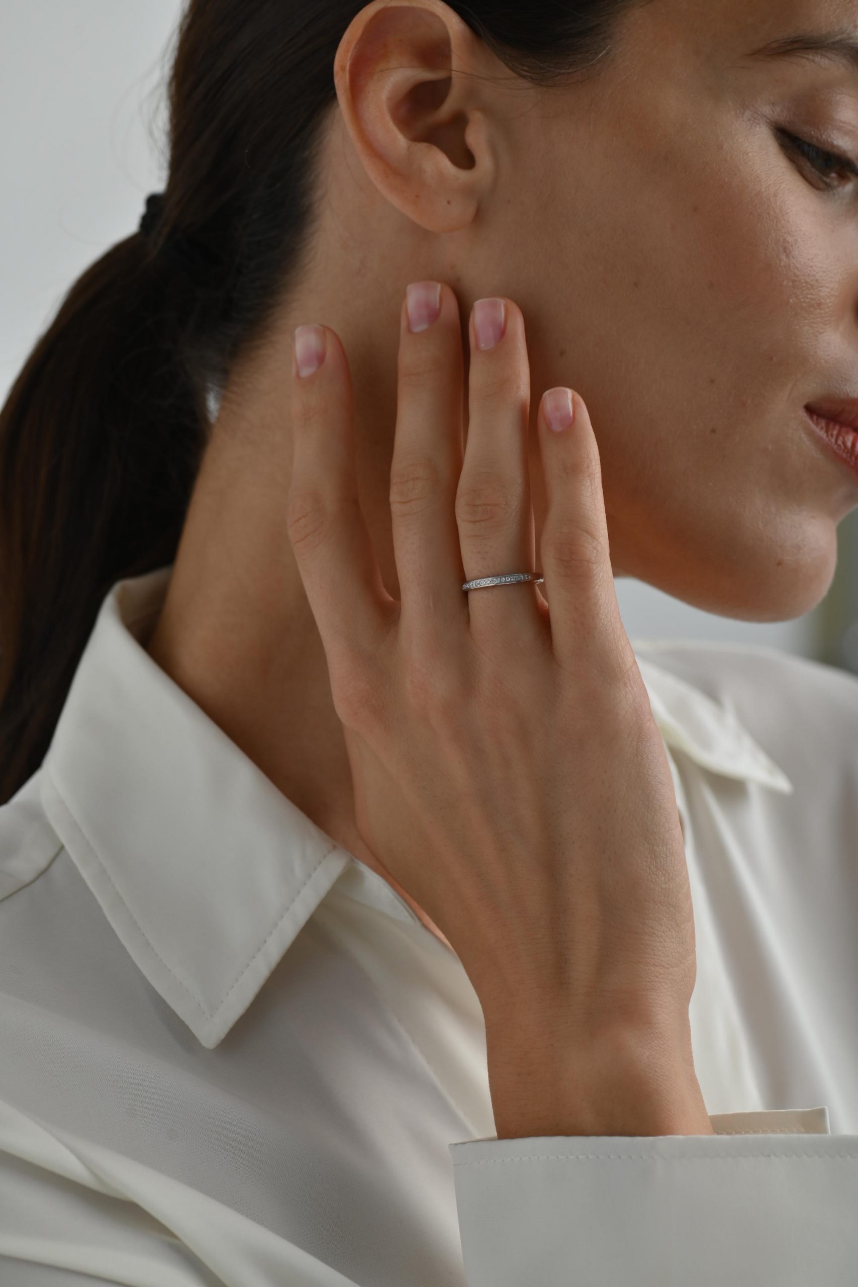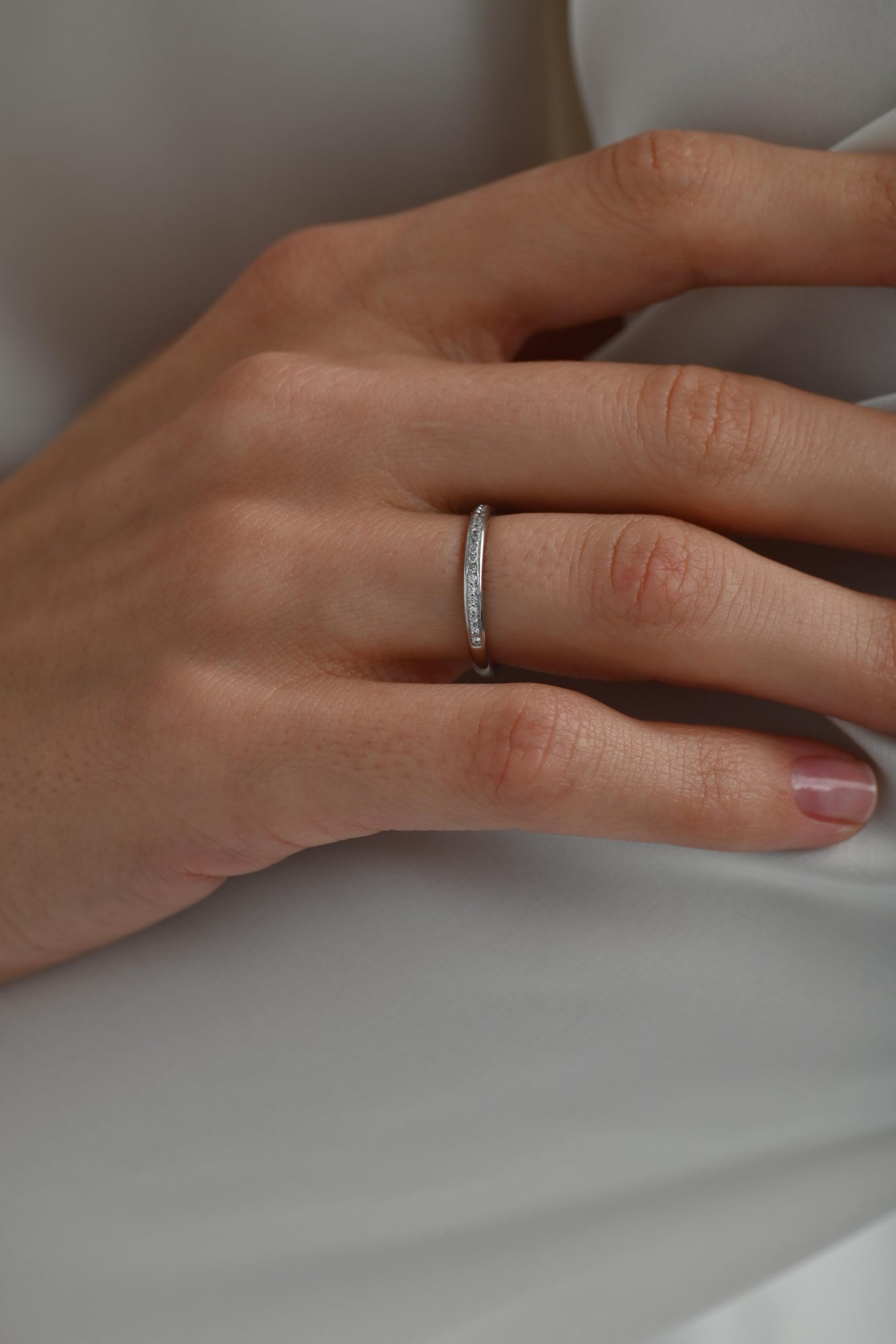 Тонкое кольцо с закрытой дорожкой бриллиантов — нежный и элегантный вариант обручального кольца. Аккуратно закреплённые камни создают мягкое, ровное сияние по всей поверхности, сохраняя при этом комфорт и практичность в носке.