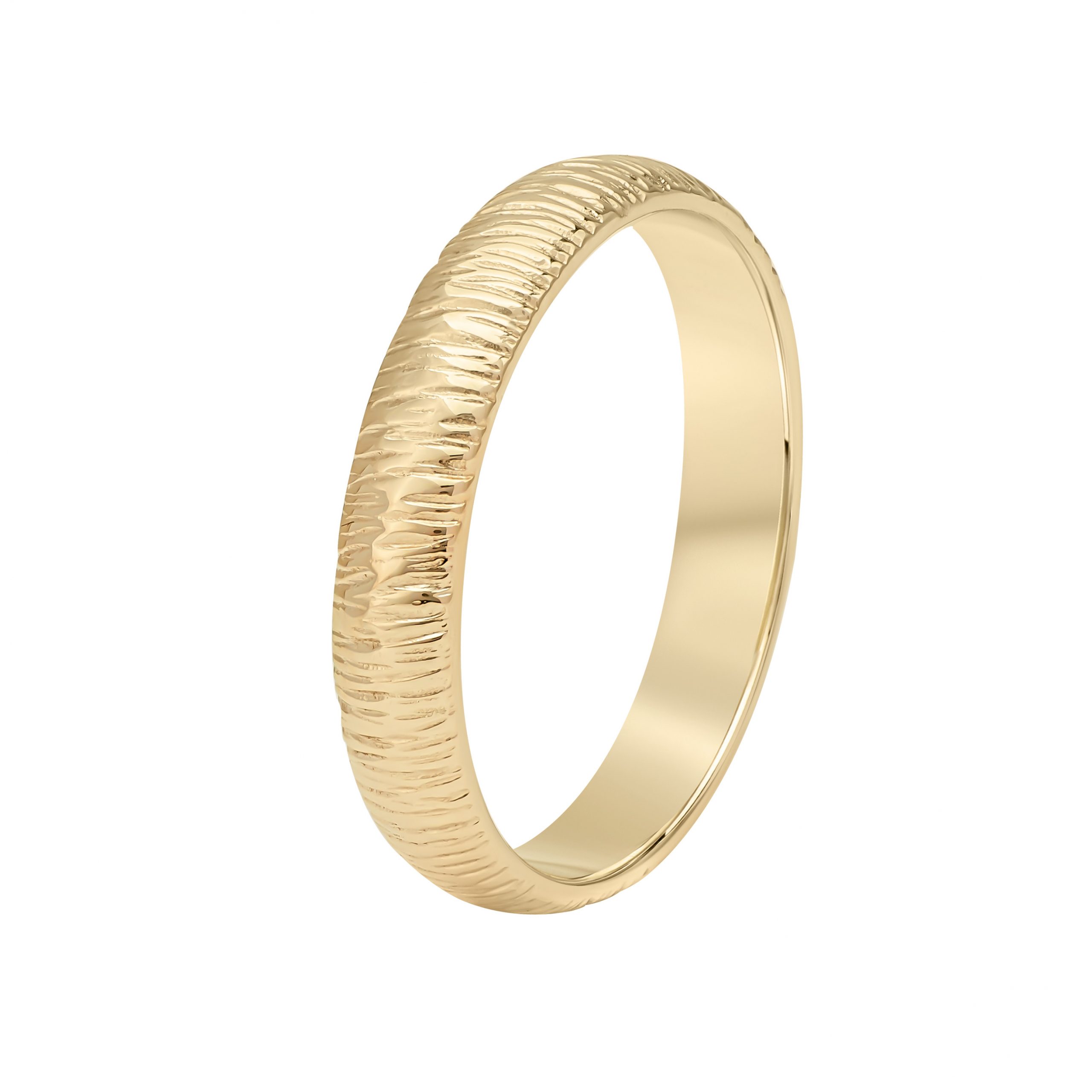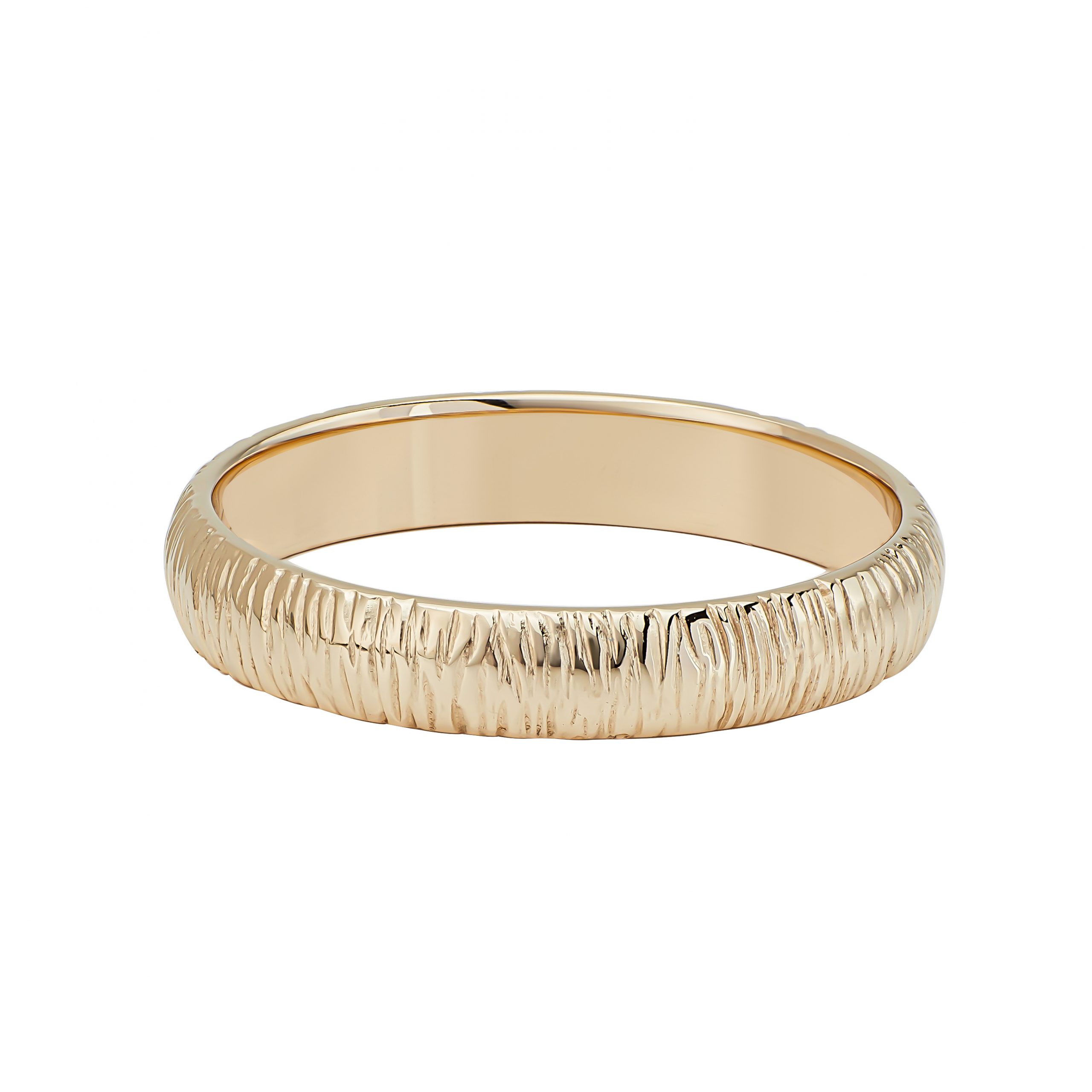 Кольцо обручальное полусфера с деревянной поперечной фактурой в желтом золоте