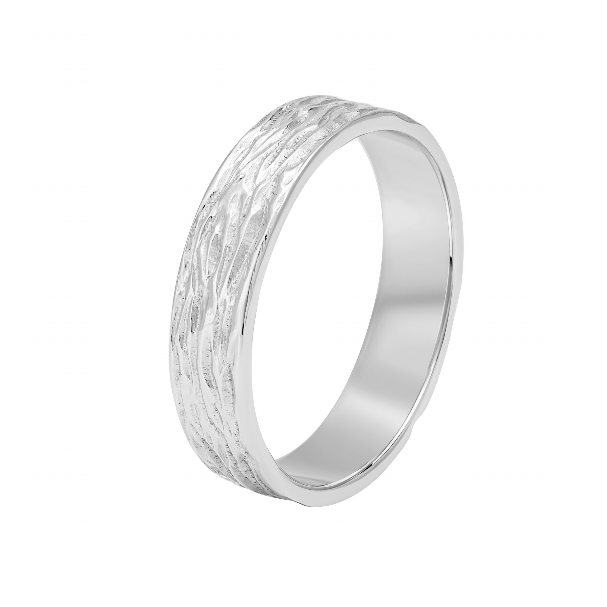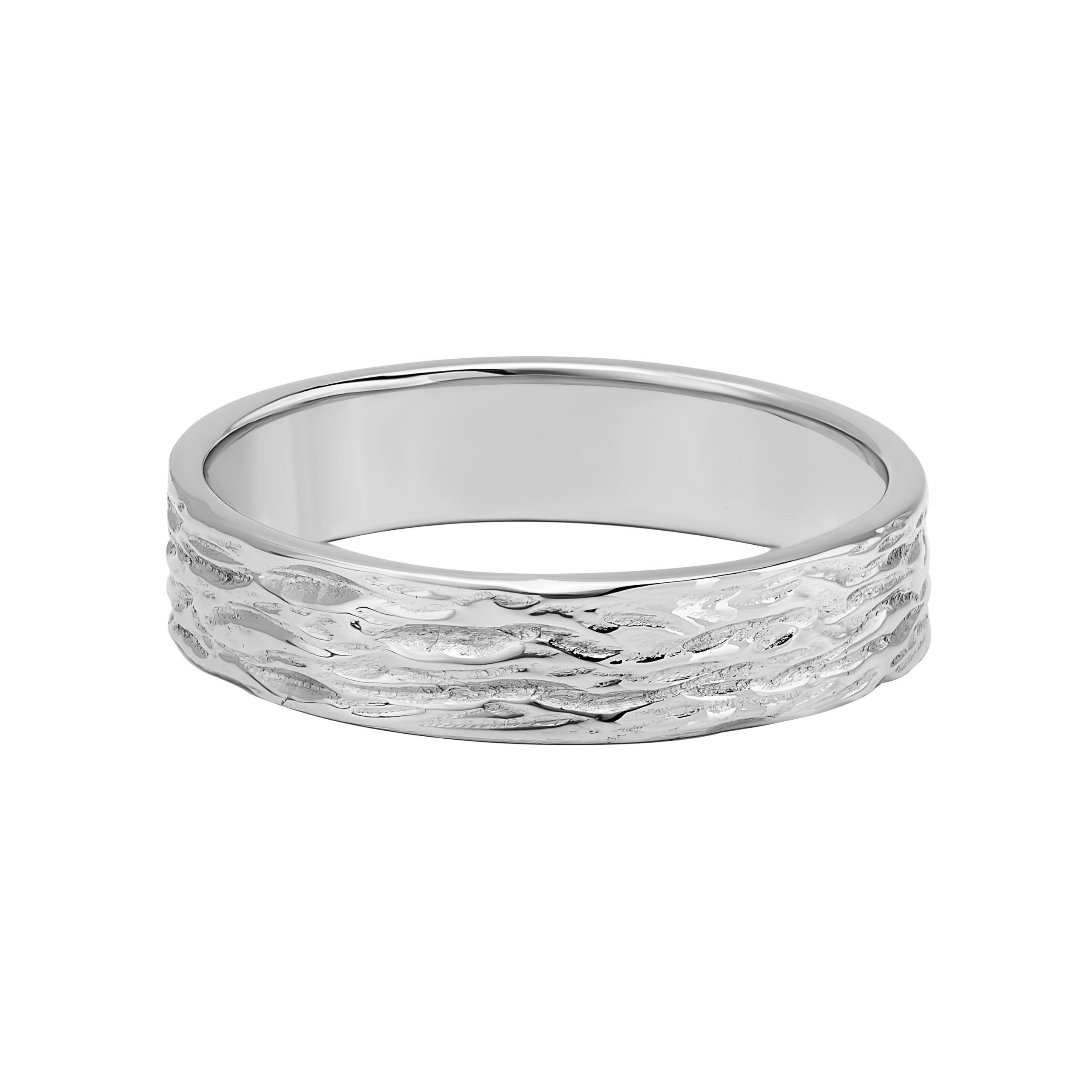 Кольцо обручальное прямая шайба с деревянной продольной фактурой в белом золоте