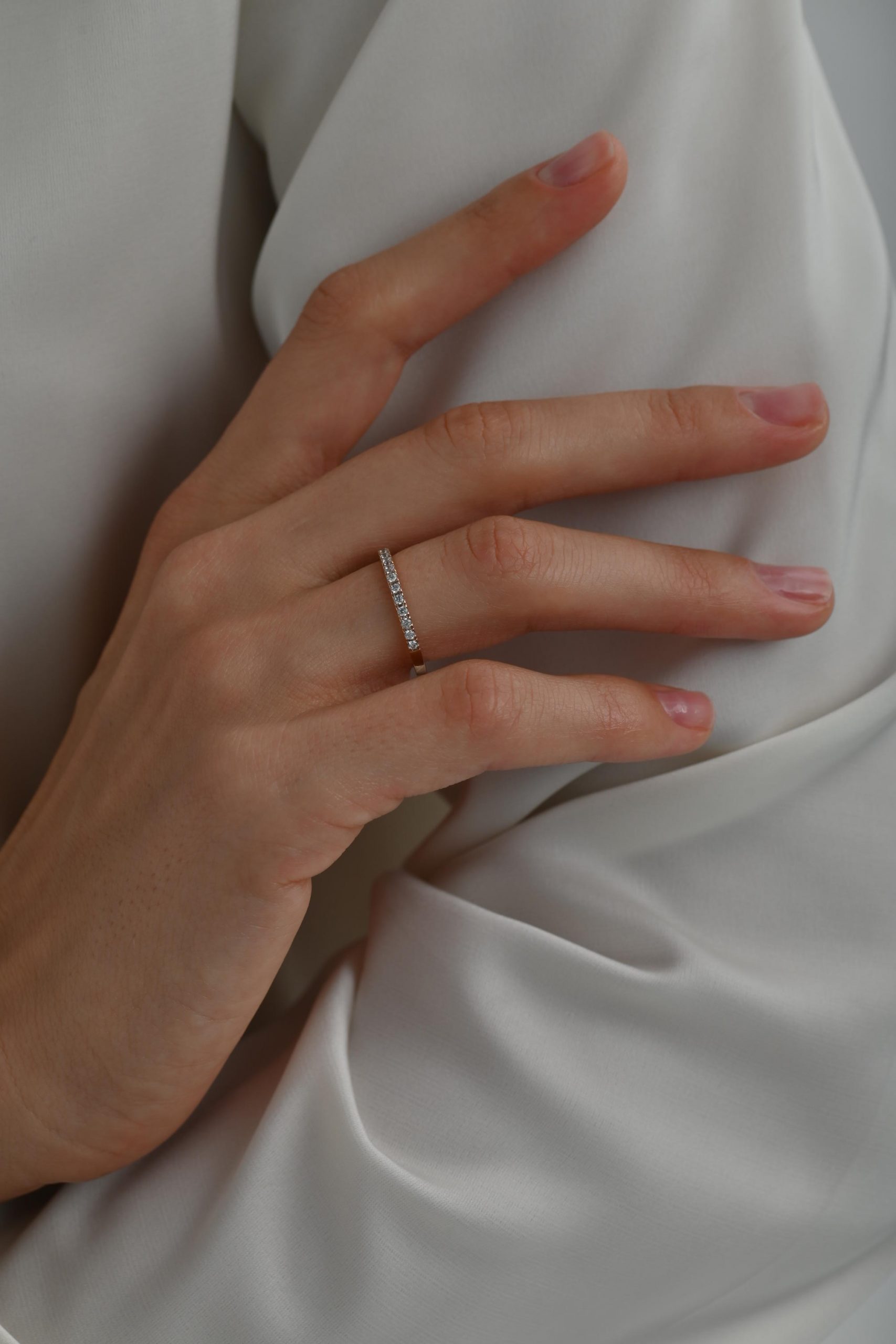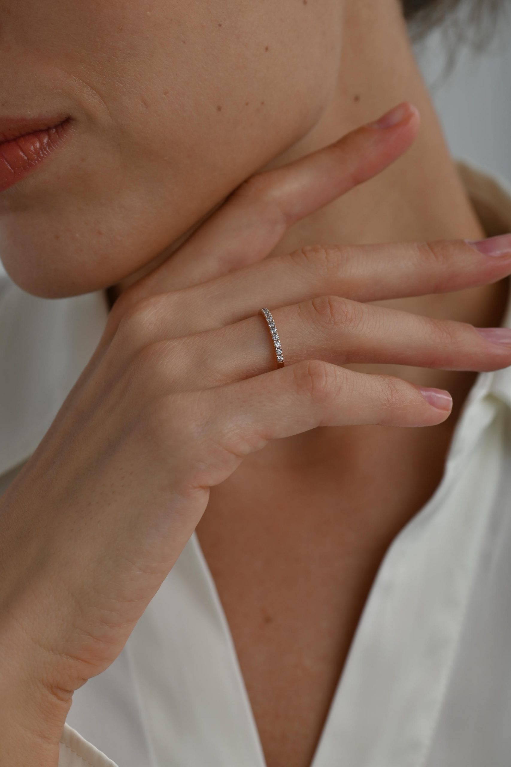 *Кольцо на фото представлено в розовом золоте, размер камней — 1,5 мм на половину окружности