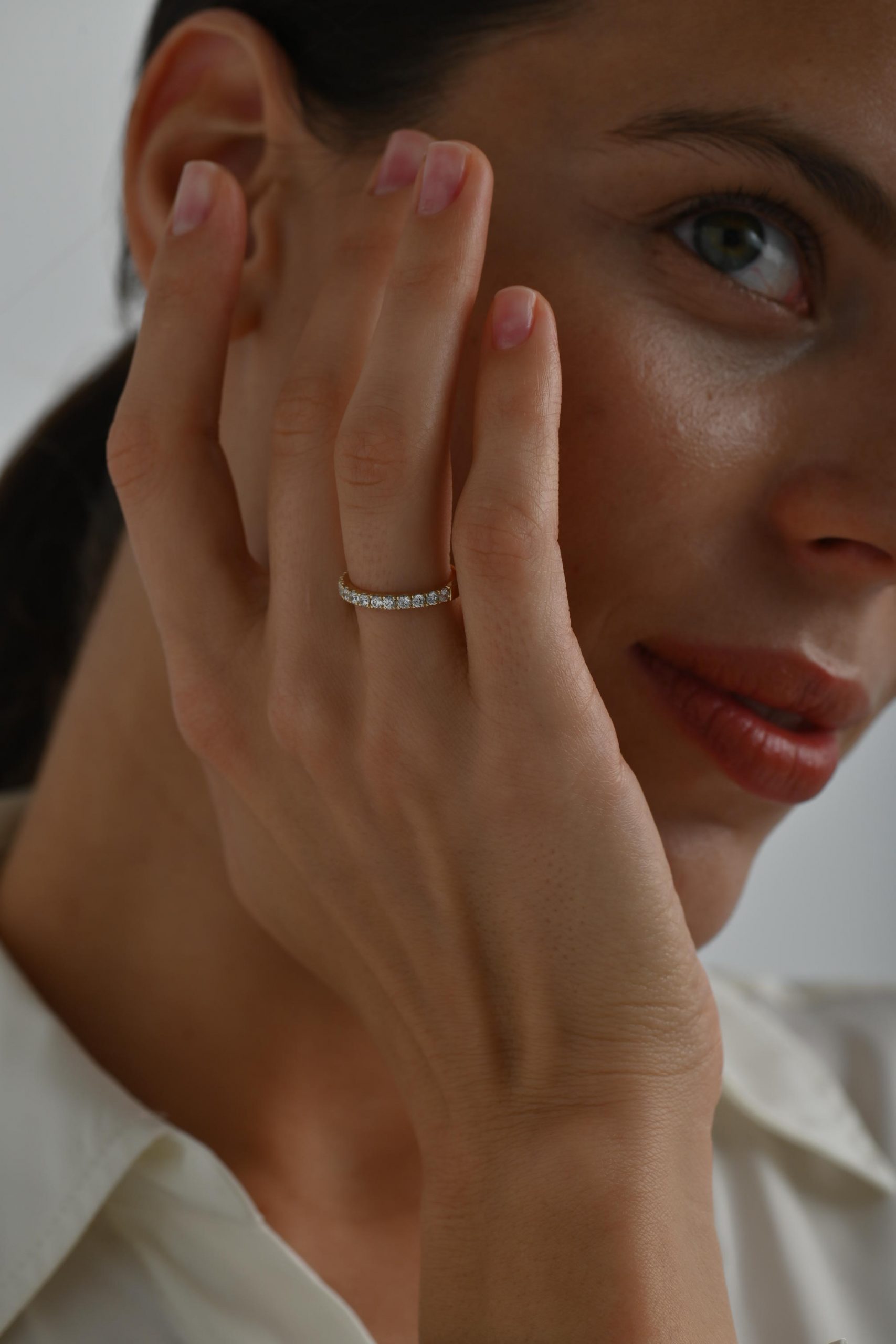 *Кольцо на фото представлено в желтом золоте, размер камней — 2 мм на половину окружности