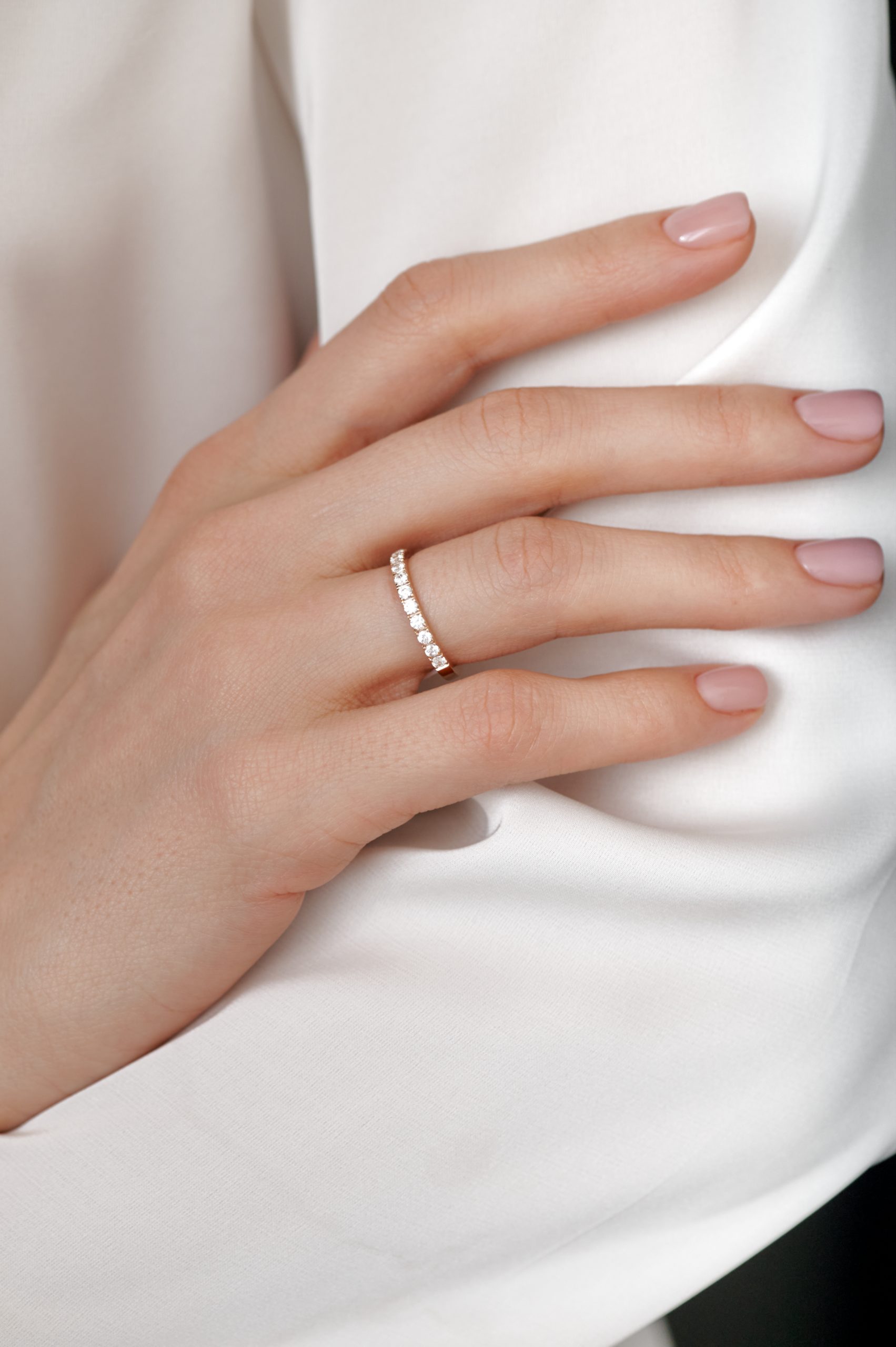 Кольцо с дорожкой бриллиантов, также известное как кольцо вечности, — один из самых популярных вариантов обручальных колец. Оно символизирует бесконечность чувств и идеально подойдёт не только для свадьбы, но и как подарок на годовщину или в честь рождения ребёнка.