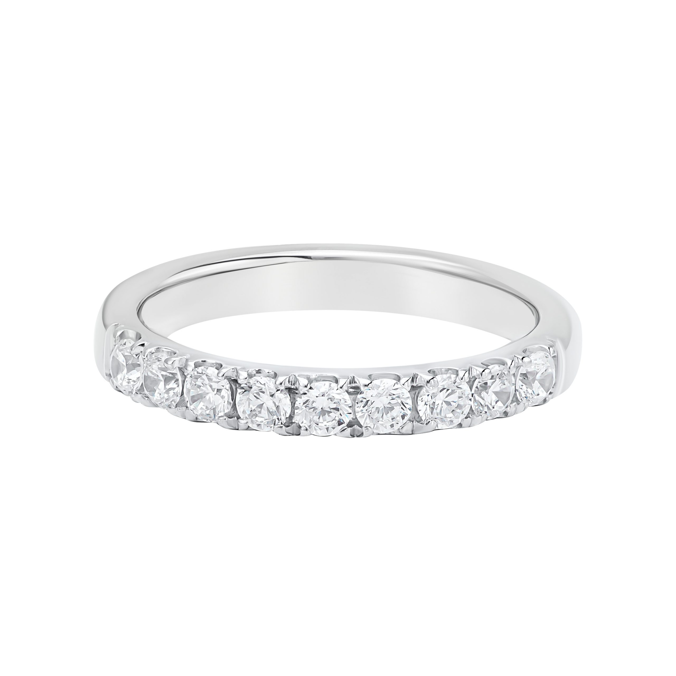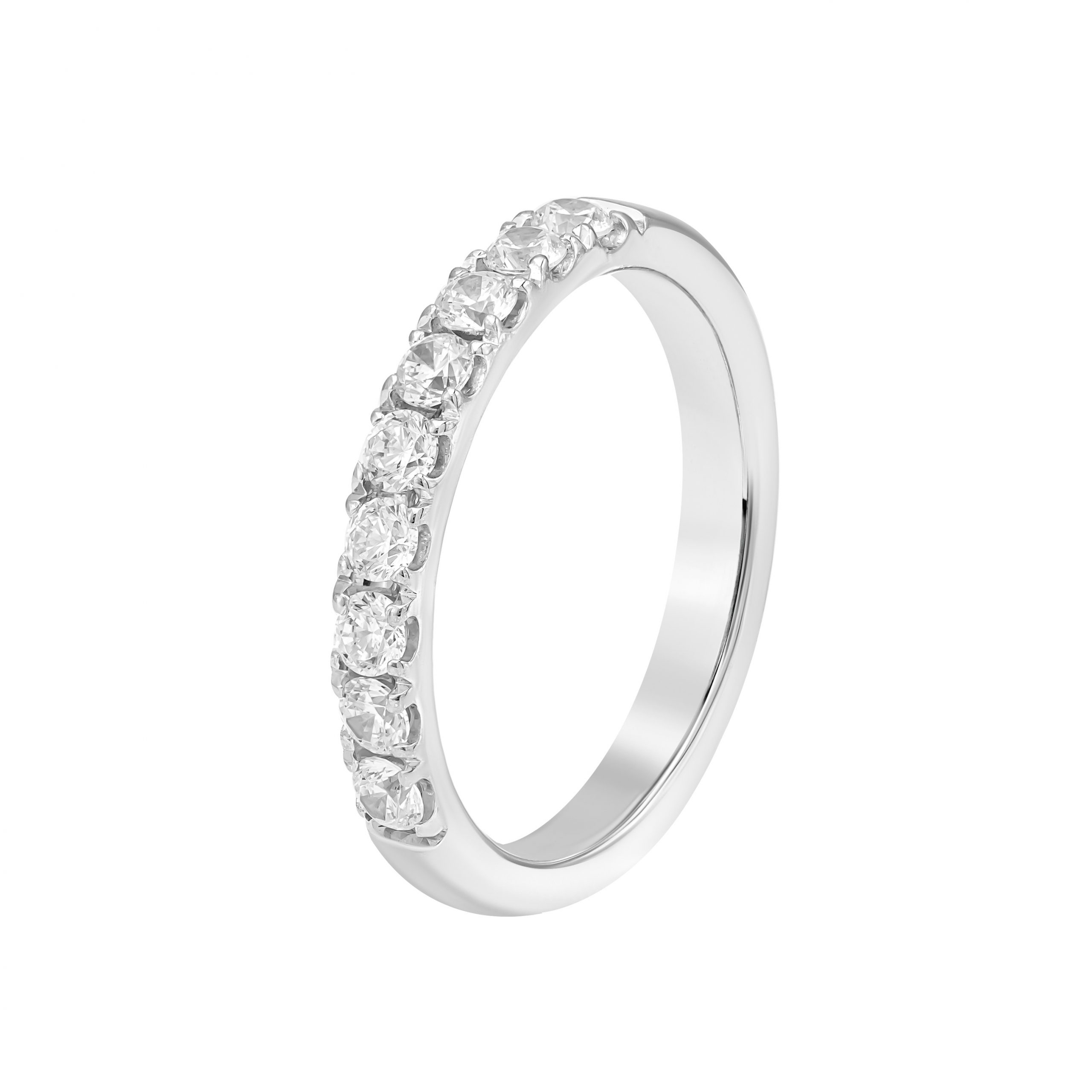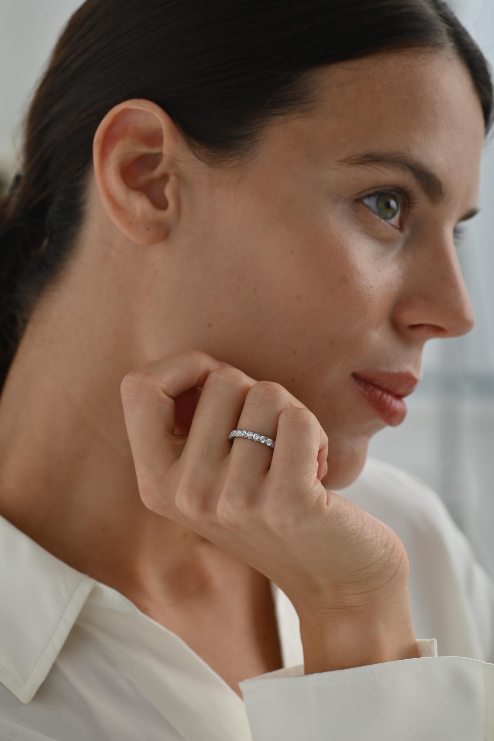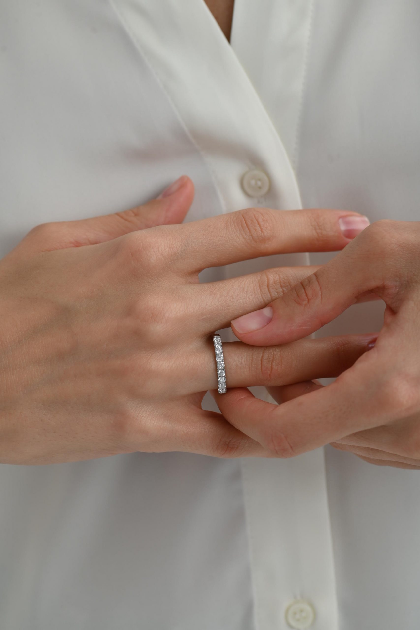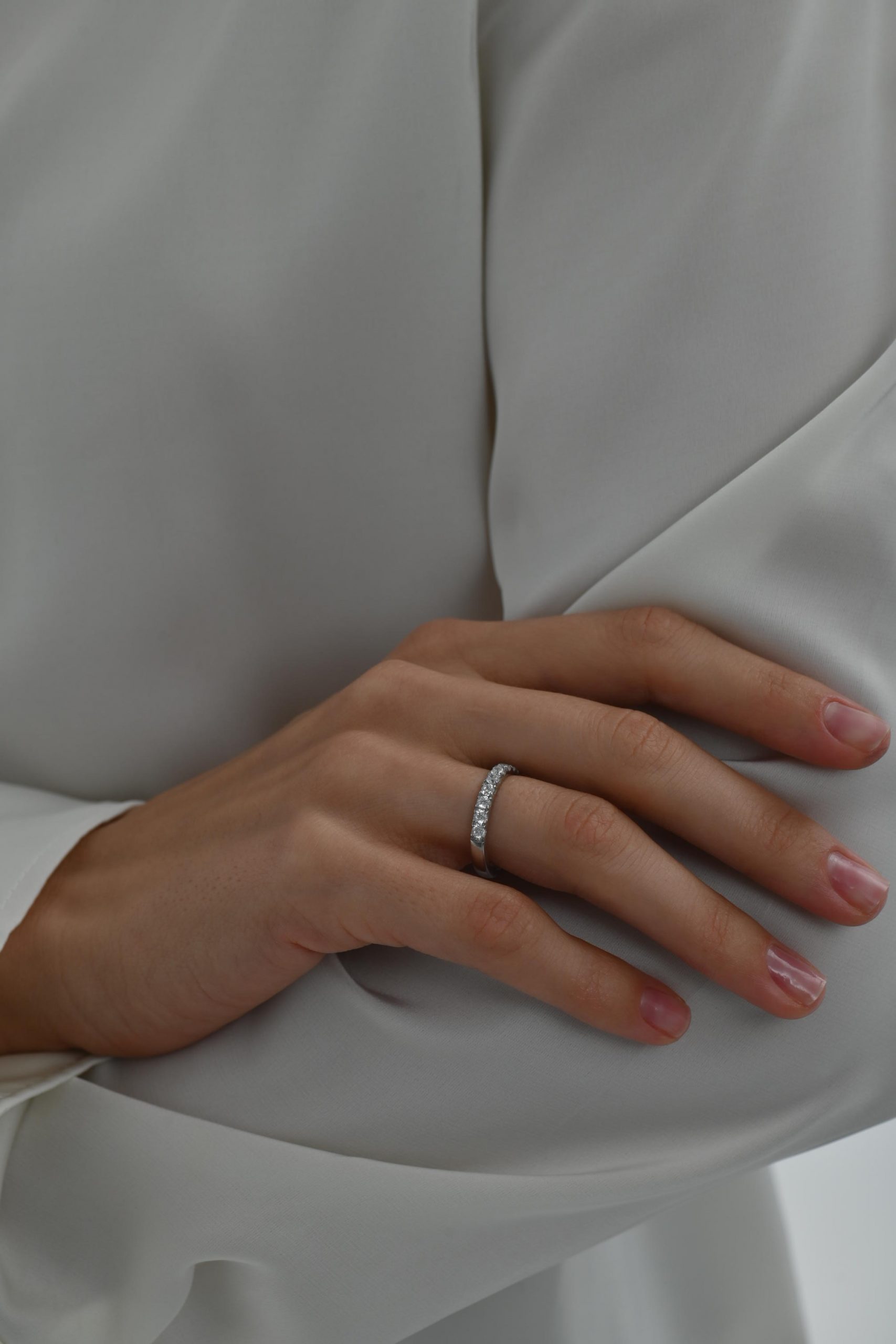 *Кольцо на фото представлено в белом золоте, размер камней — 2,5 мм, с дорожкой на треть окружности
