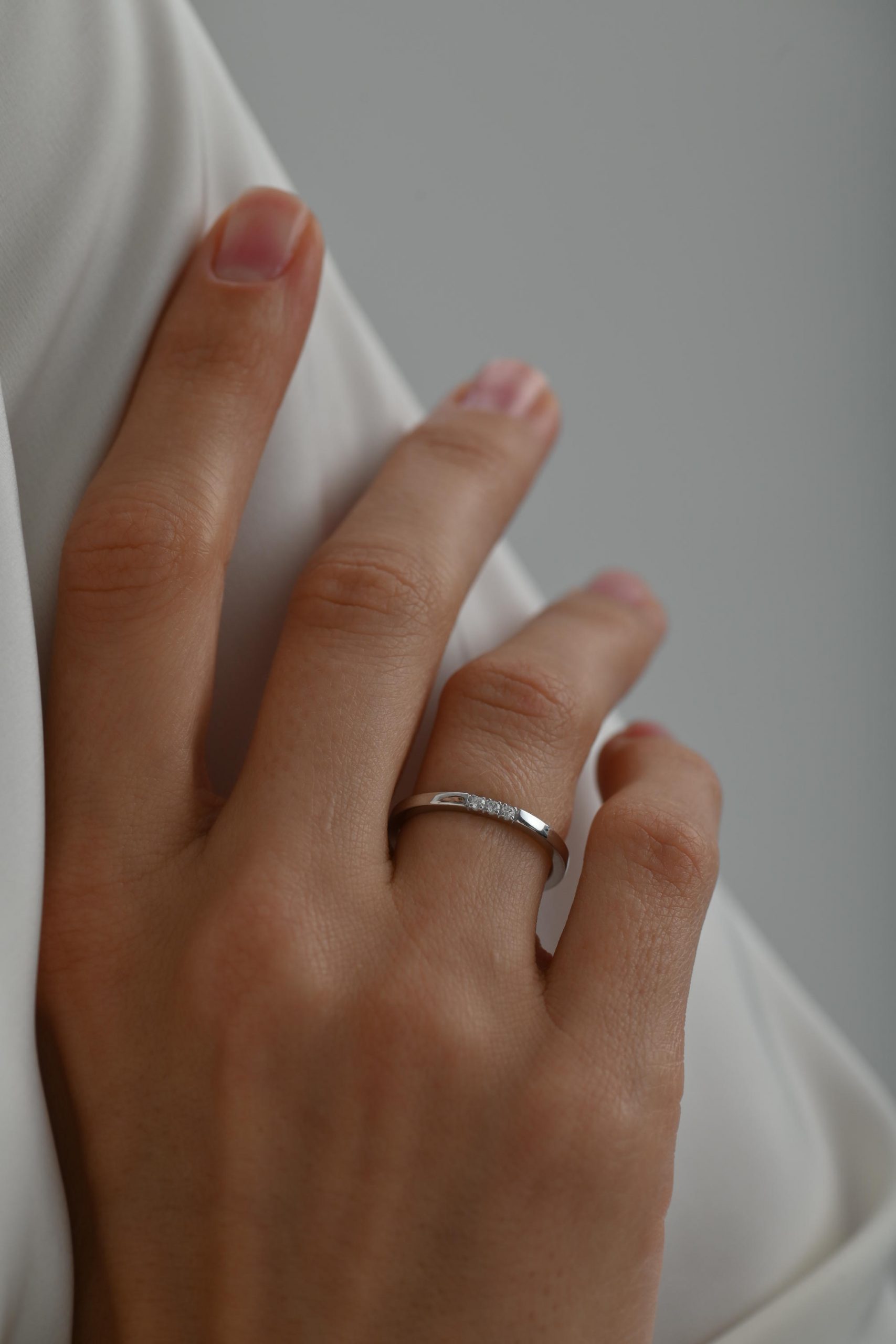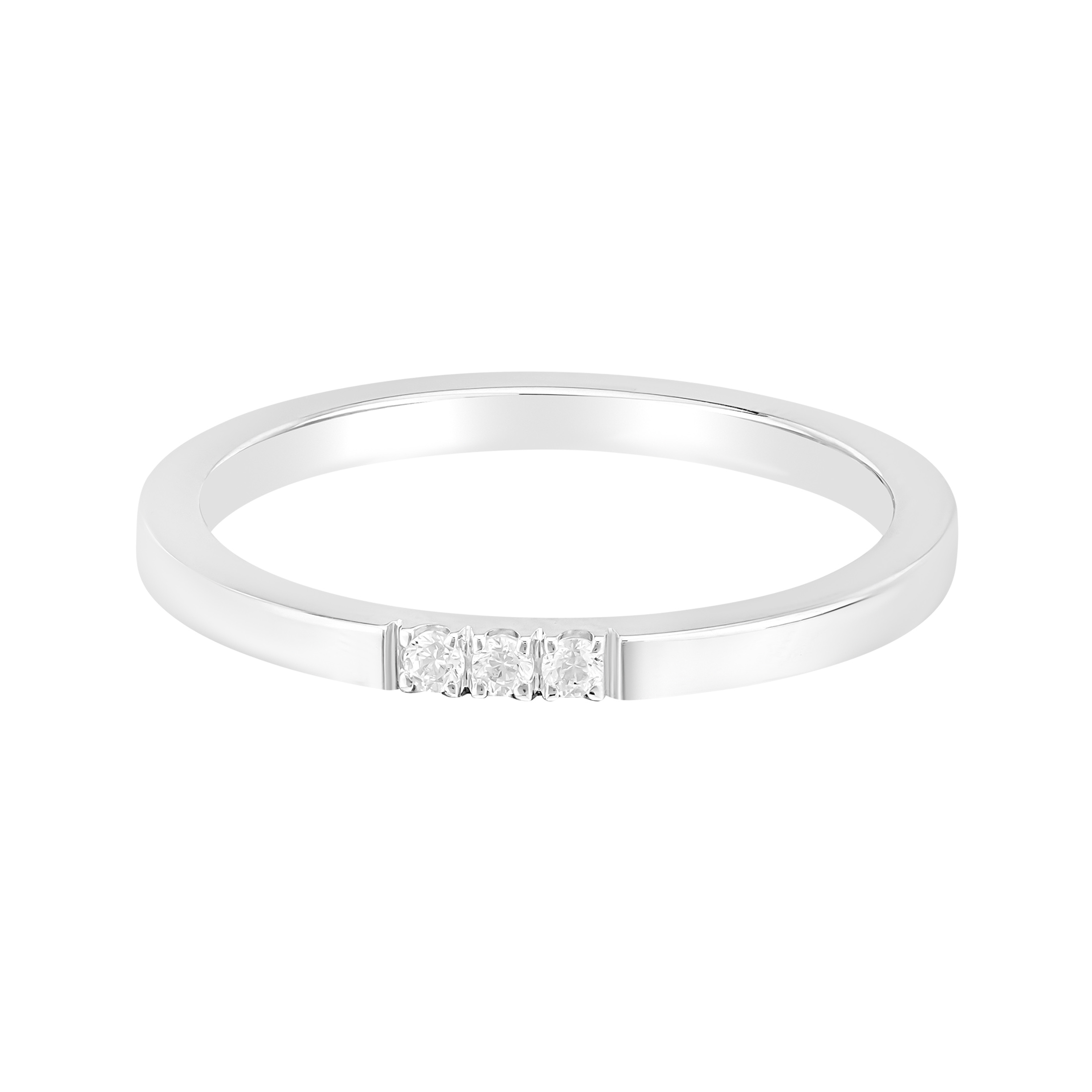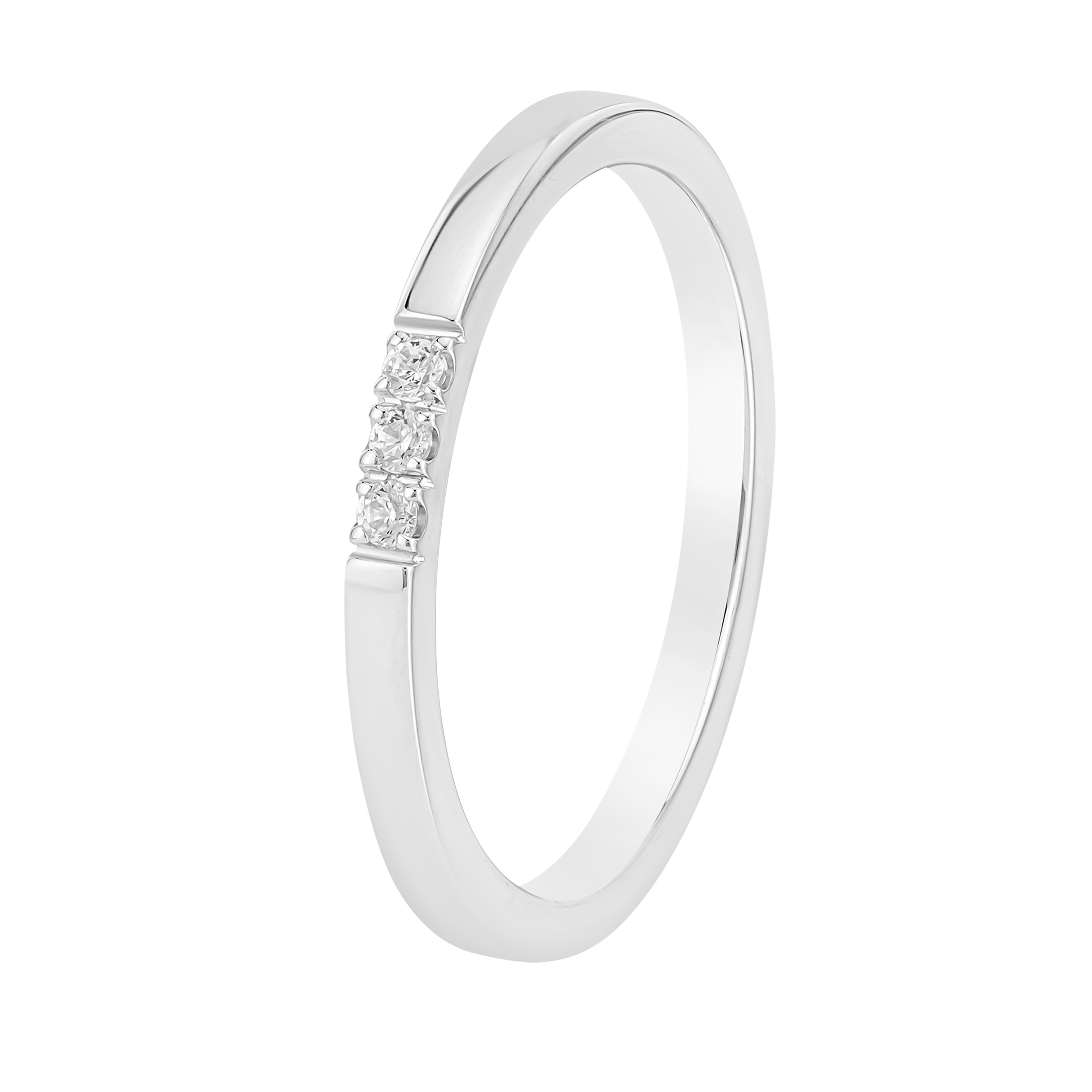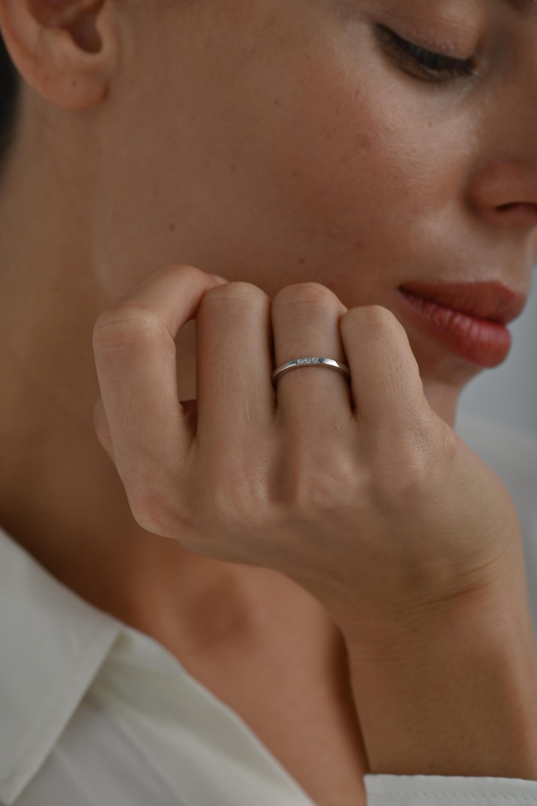 Кольцо формы «»прямая шайба»» с деликатной вставкой в виде трёх бриллиантов среднего размера.
