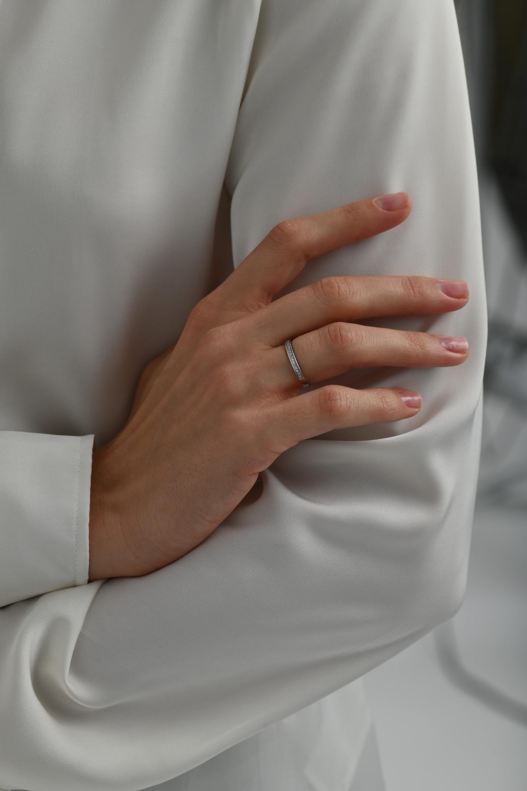 Кольцо с закрытой дорожкой бриллиантов — идеальная комбинация нежности и строгой утонченности. Изысканное обрамление органично дополняет невероятный блеск камней.
