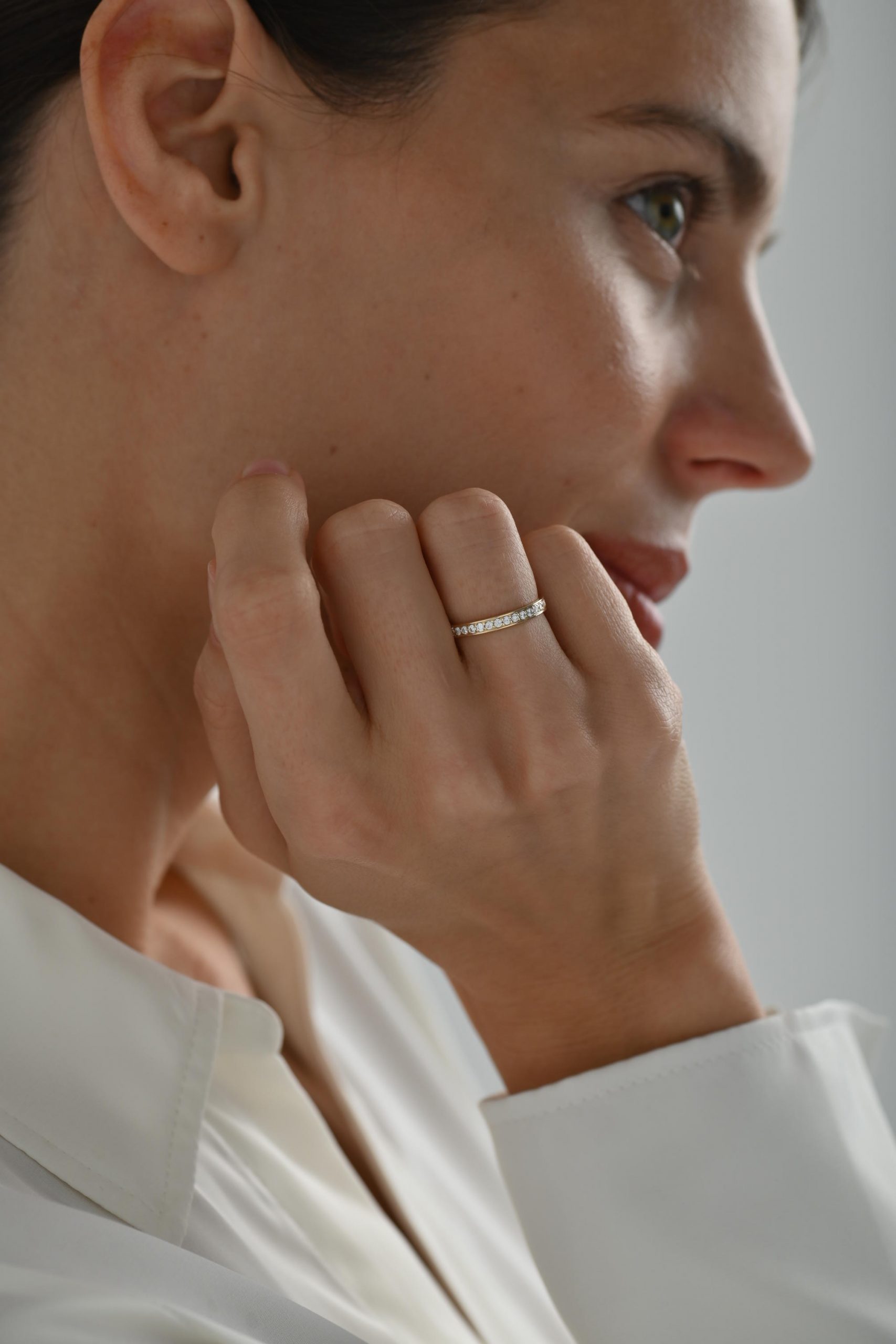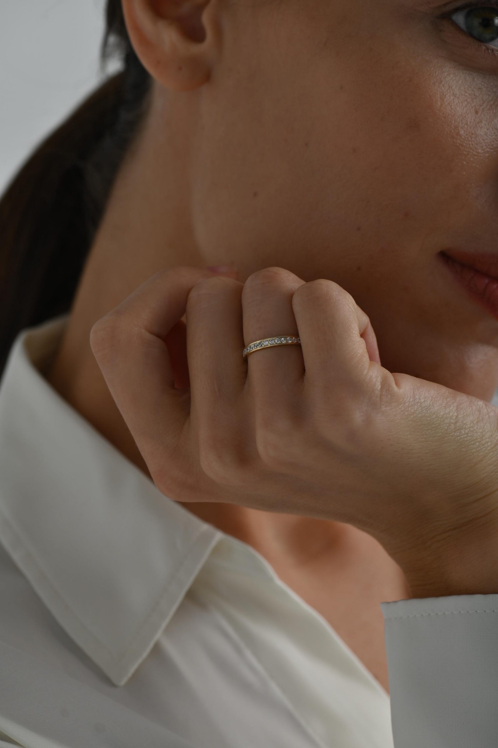 *Кольцо на фото представлено в желтом золоте, размер камней — 1,5 мм на половину окружности