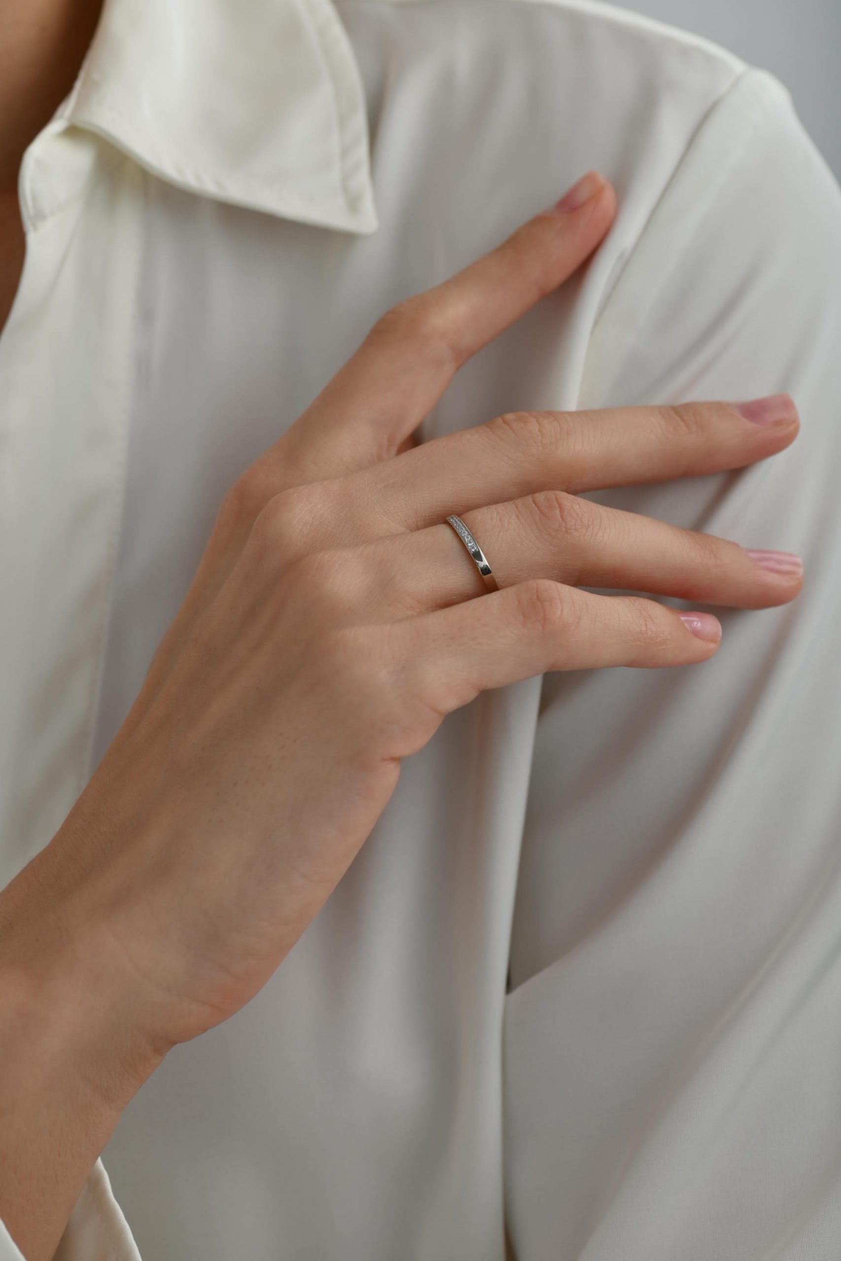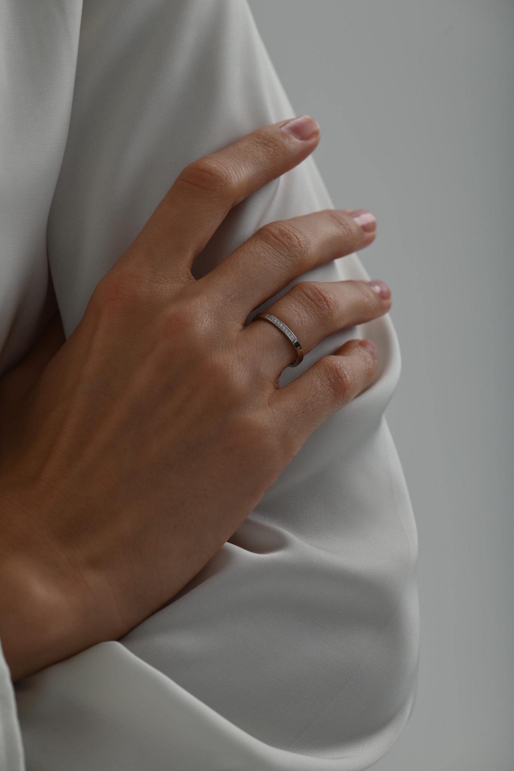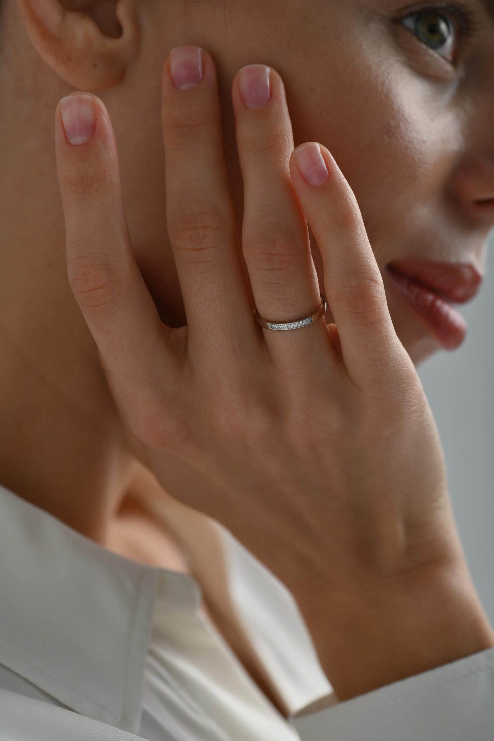 Кольцо с изящной и небольшой дорожкой бриллиантов. Такой дизайн отлично сочетается с другими украшениями и подойдёт тем, кто ищет сдержанное, но эффектное кольцо с бриллиантами.