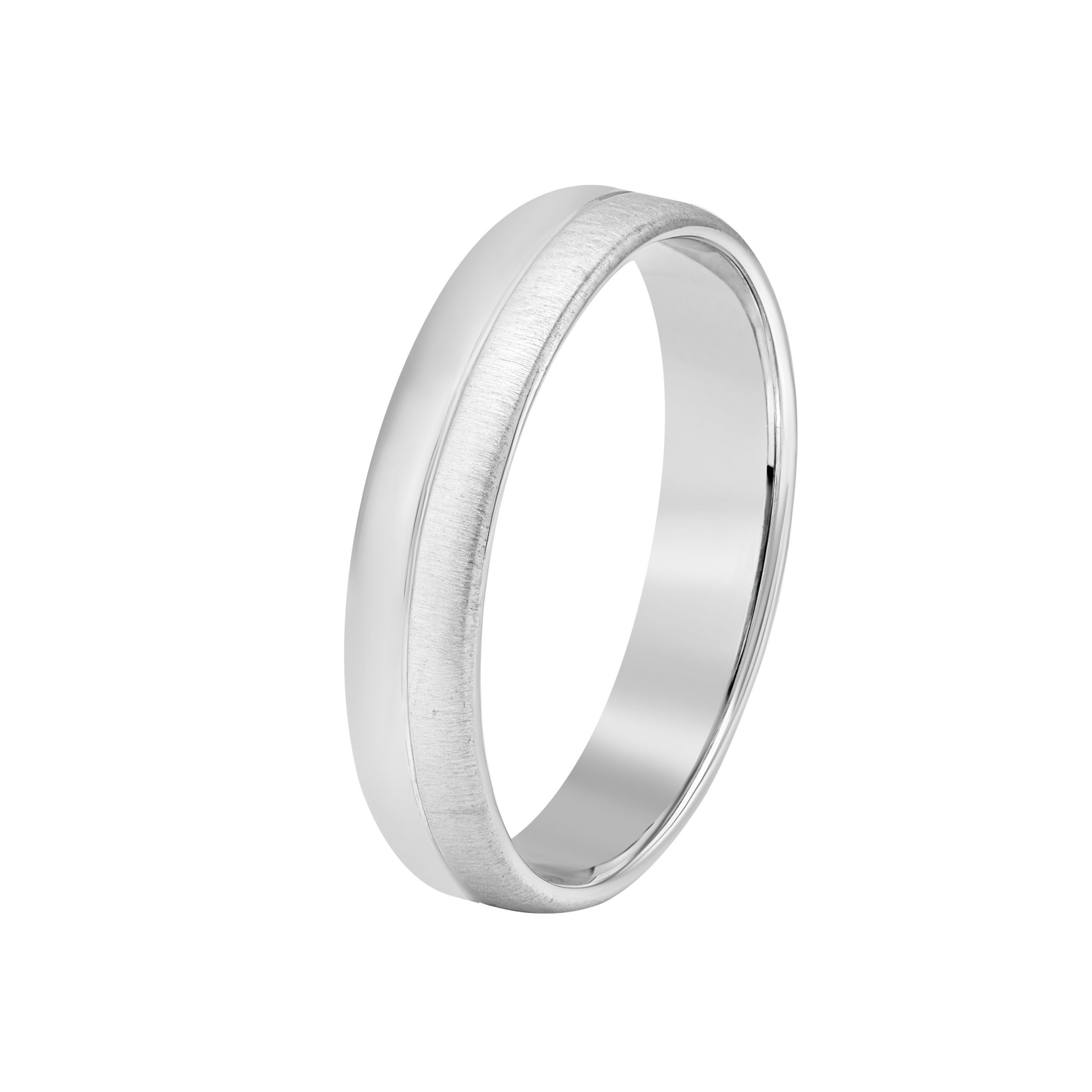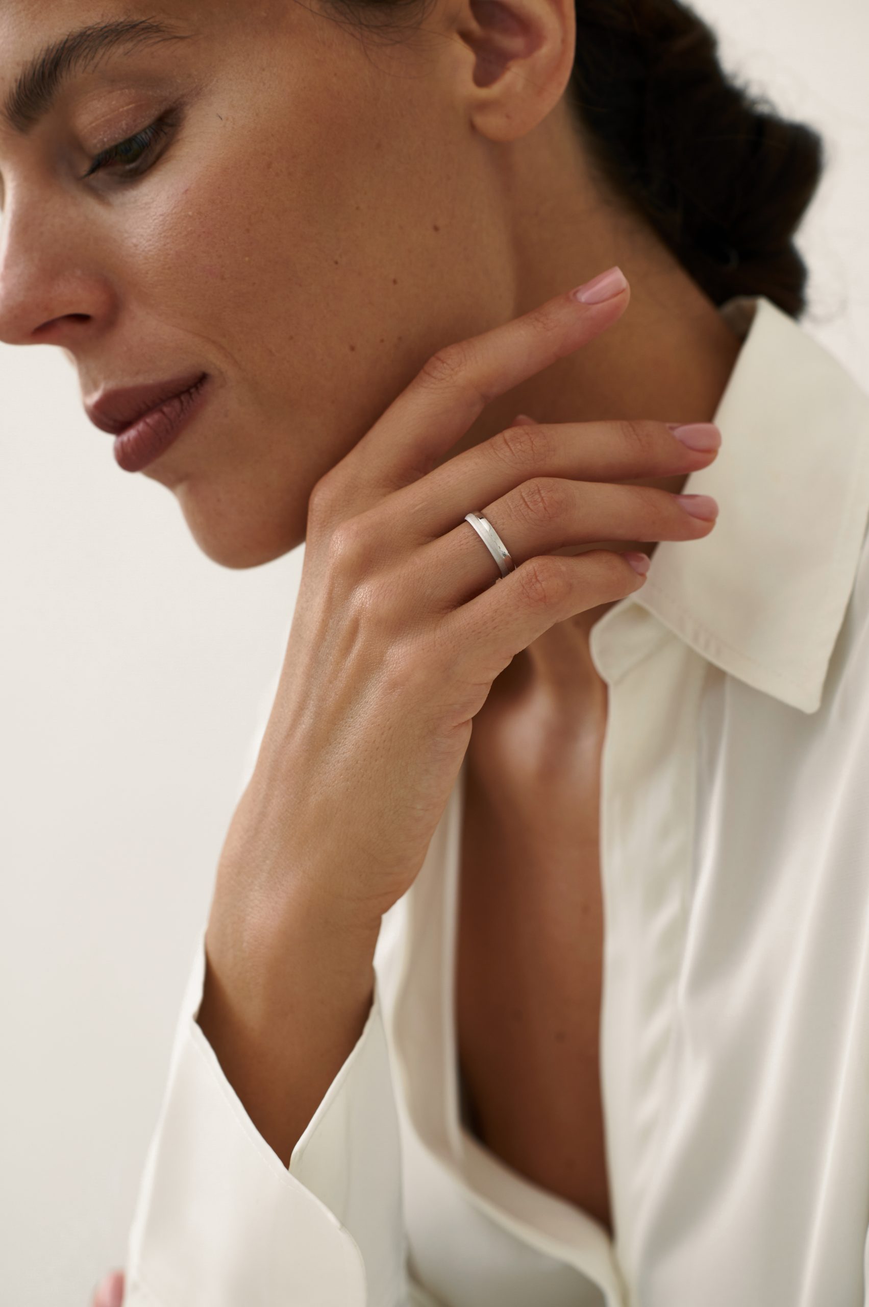 Кольцо с закруглёнными краями мягко и комфортно облегает палец, обеспечивая приятную посадку на каждый день. Дизайн разделён ровно пополам: одна часть выполнена с сатиновой матовкой, другая — с гладким глянцевым блеском. Такое сочетание делает кольцо интересным и сбалансированным вариантом для тех, кто хочет классический глянцевый стиль с лёгкой, но выразительной изюминкой.