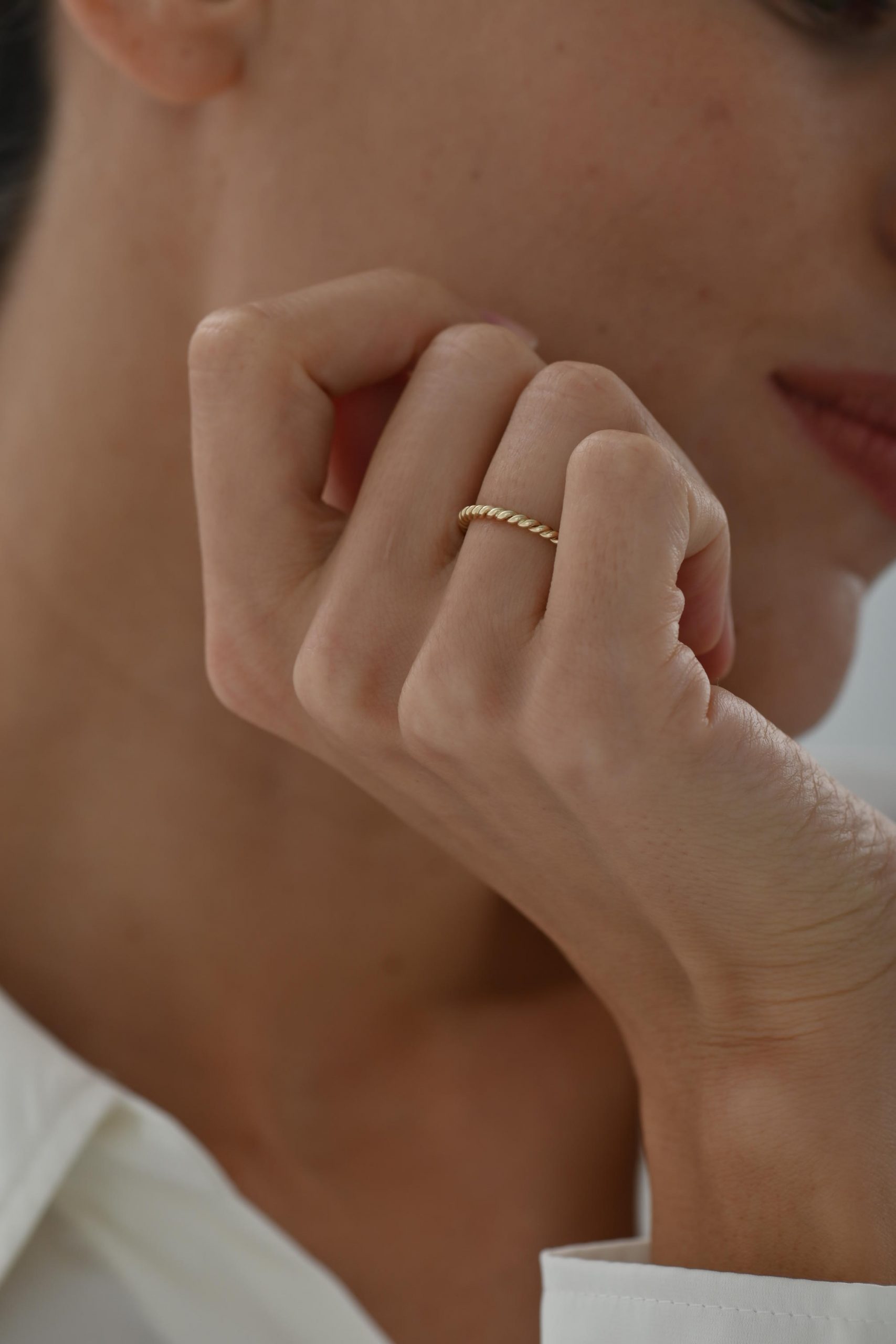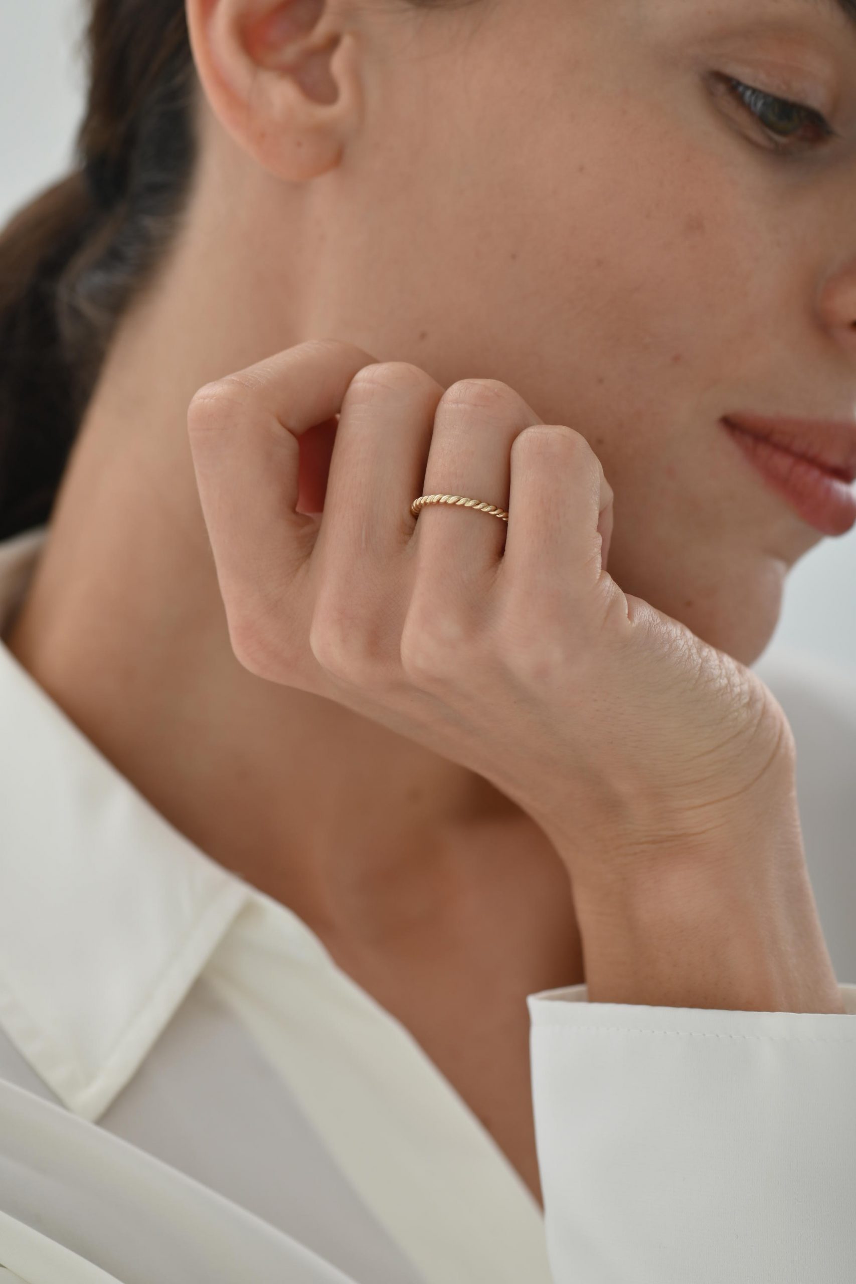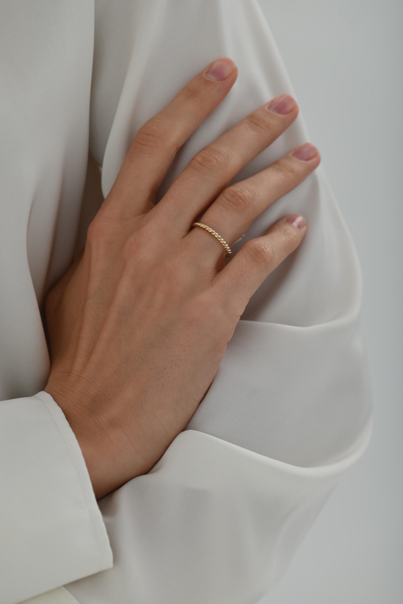 Аккуратное переплетение, словно символ связи, которая становится только крепче со временем. Оно выглядит изящно и легко, но в нём чувствуется внутренняя прочность. Чаще всего такое кольцо выбирают как дополнение к помолвочному или обручальному.