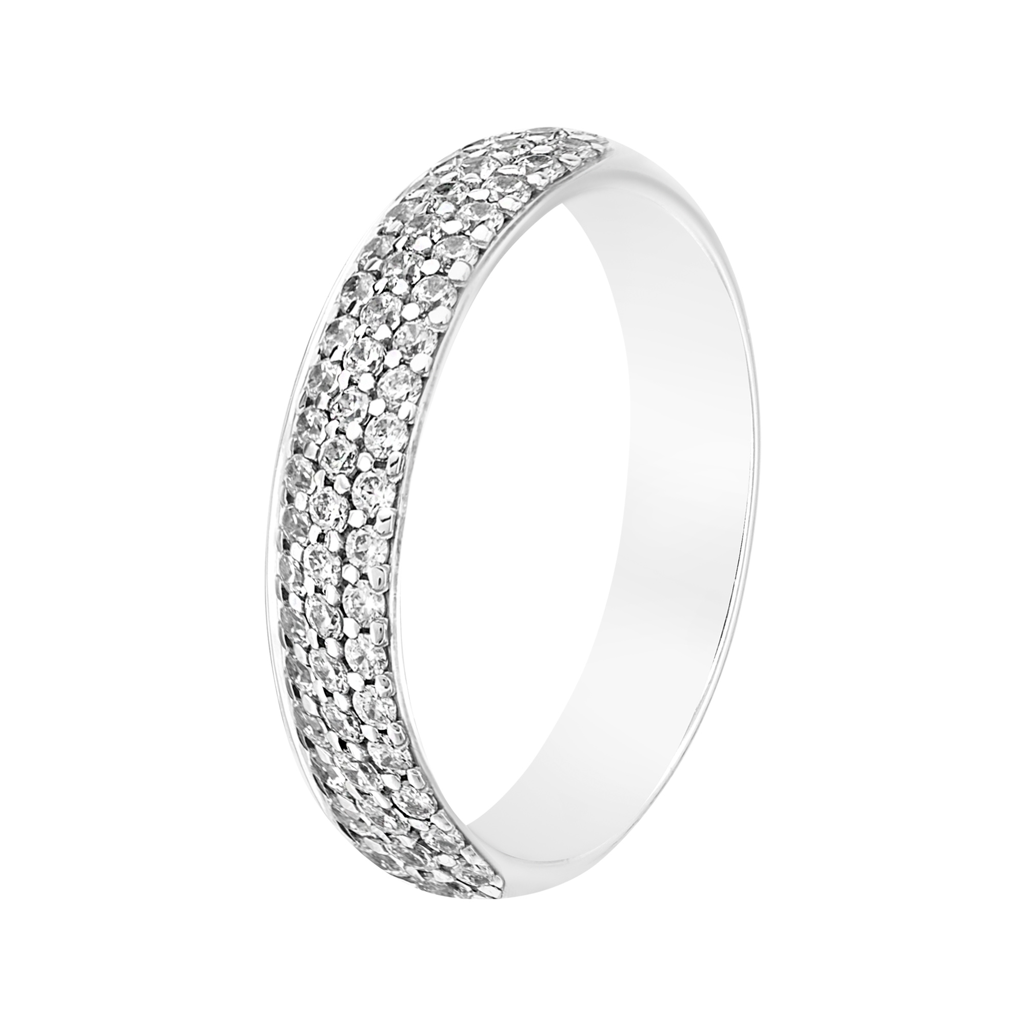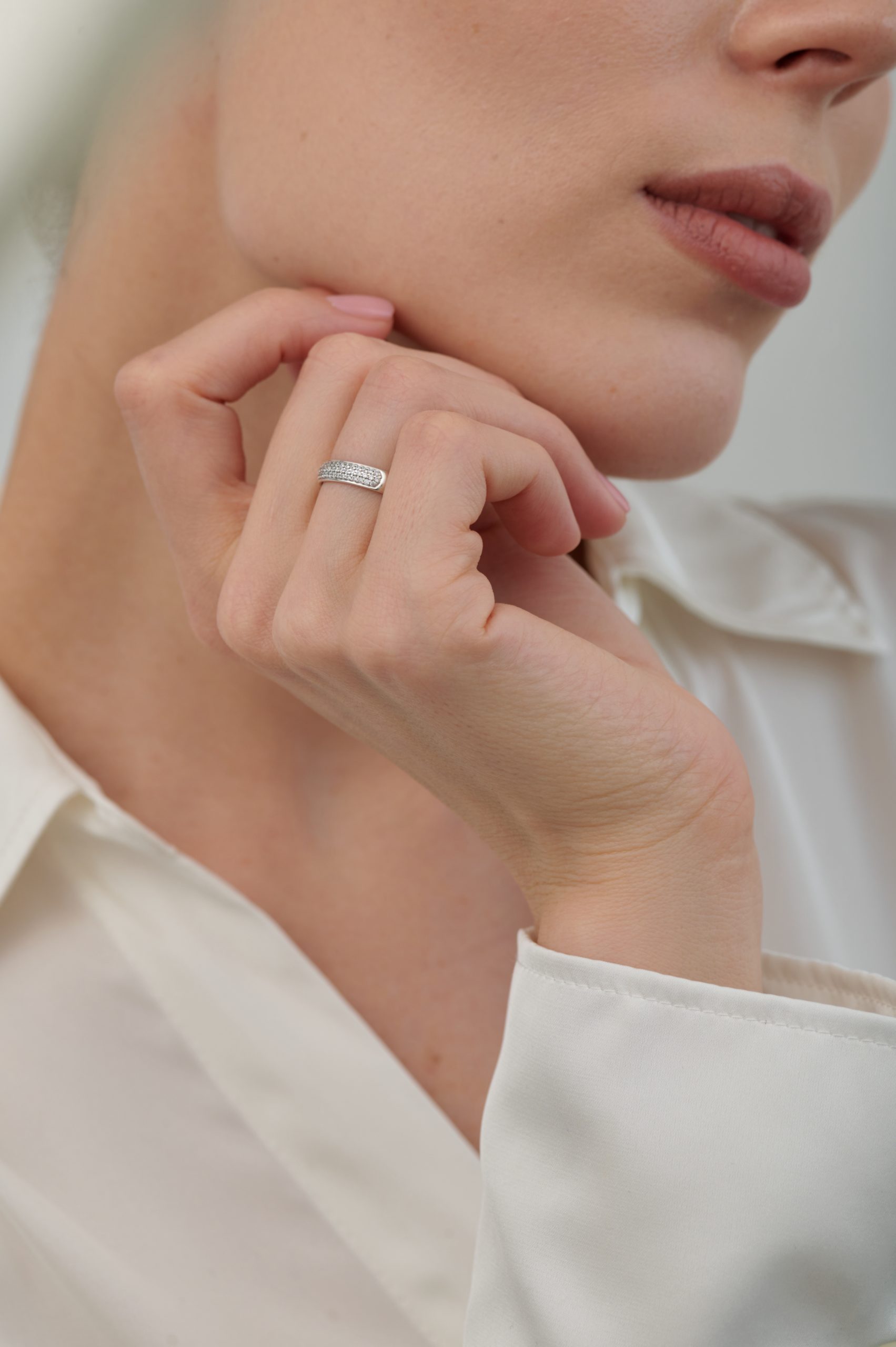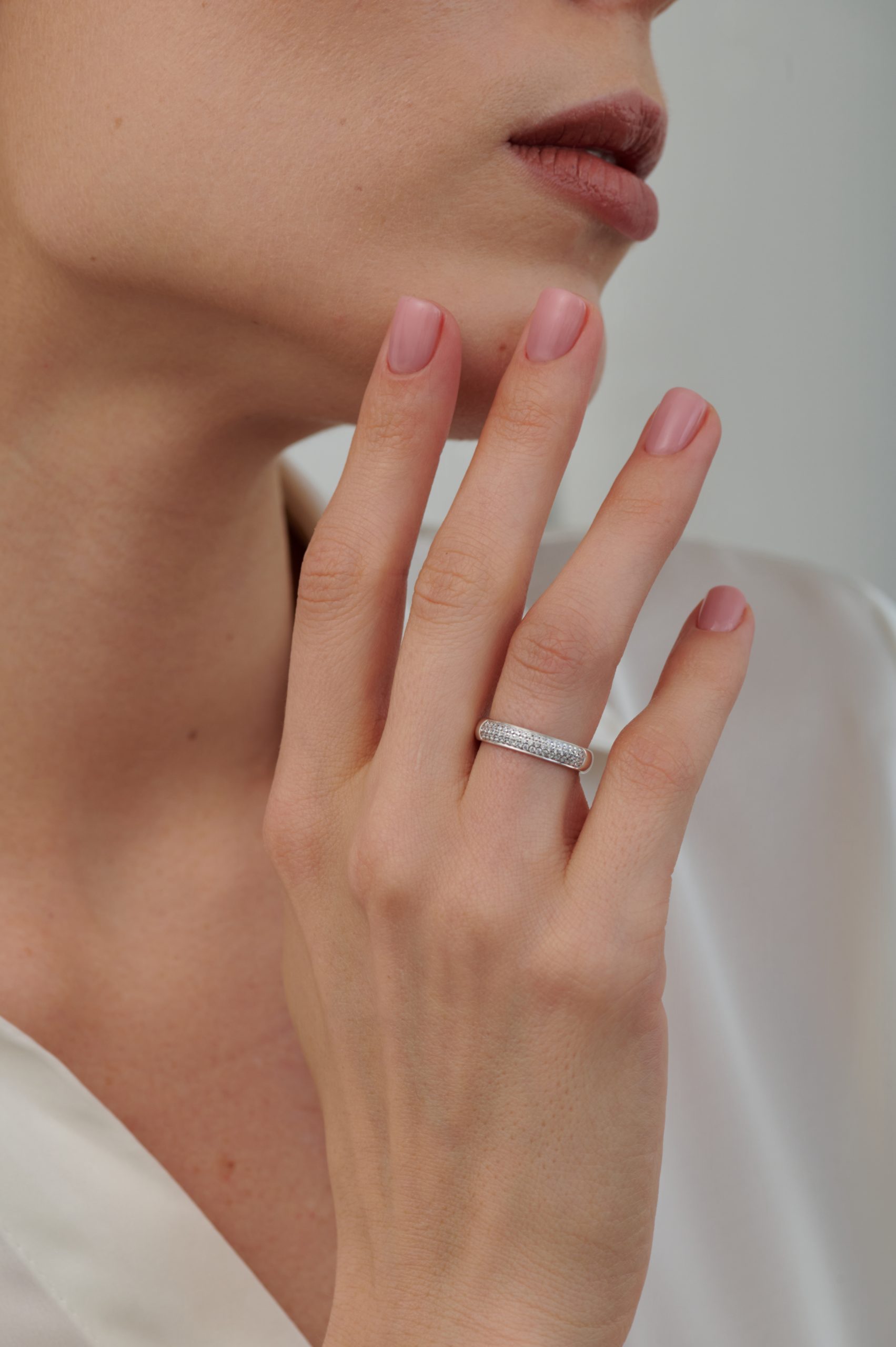 Кольцо с тремя дорожками бриллиантов, заключёнными в изящную полусферу, — это утончённая интерпретация классического дизайна. Бриллианты словно спрятаны в объятиях металла, создавая ощущение легкости и гармонии.
