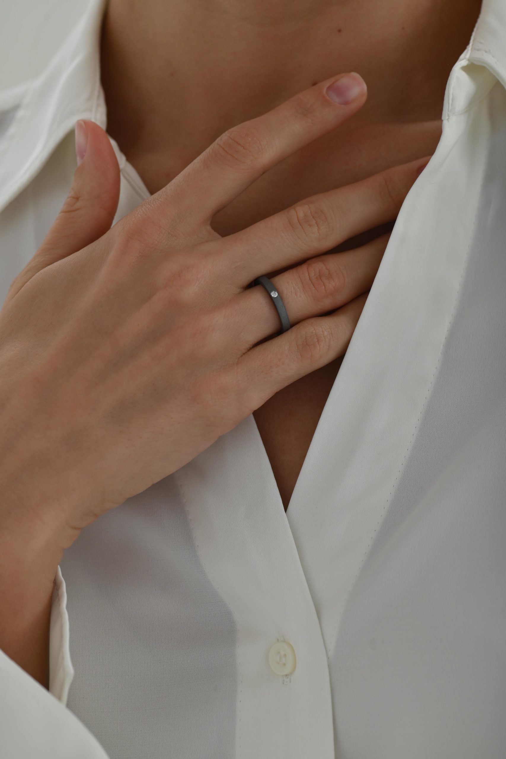 Для тех, кто любит выделяться. Его поверхность покрыта алмазной матовкой, что придаёт металлу благородную, чуть шершавую текстуру. В центре — бриллиант, спокойный и уверенный акцент. Но главное, что делает это кольцо по-настоящему особенным — чёрное родиевое покрытие.