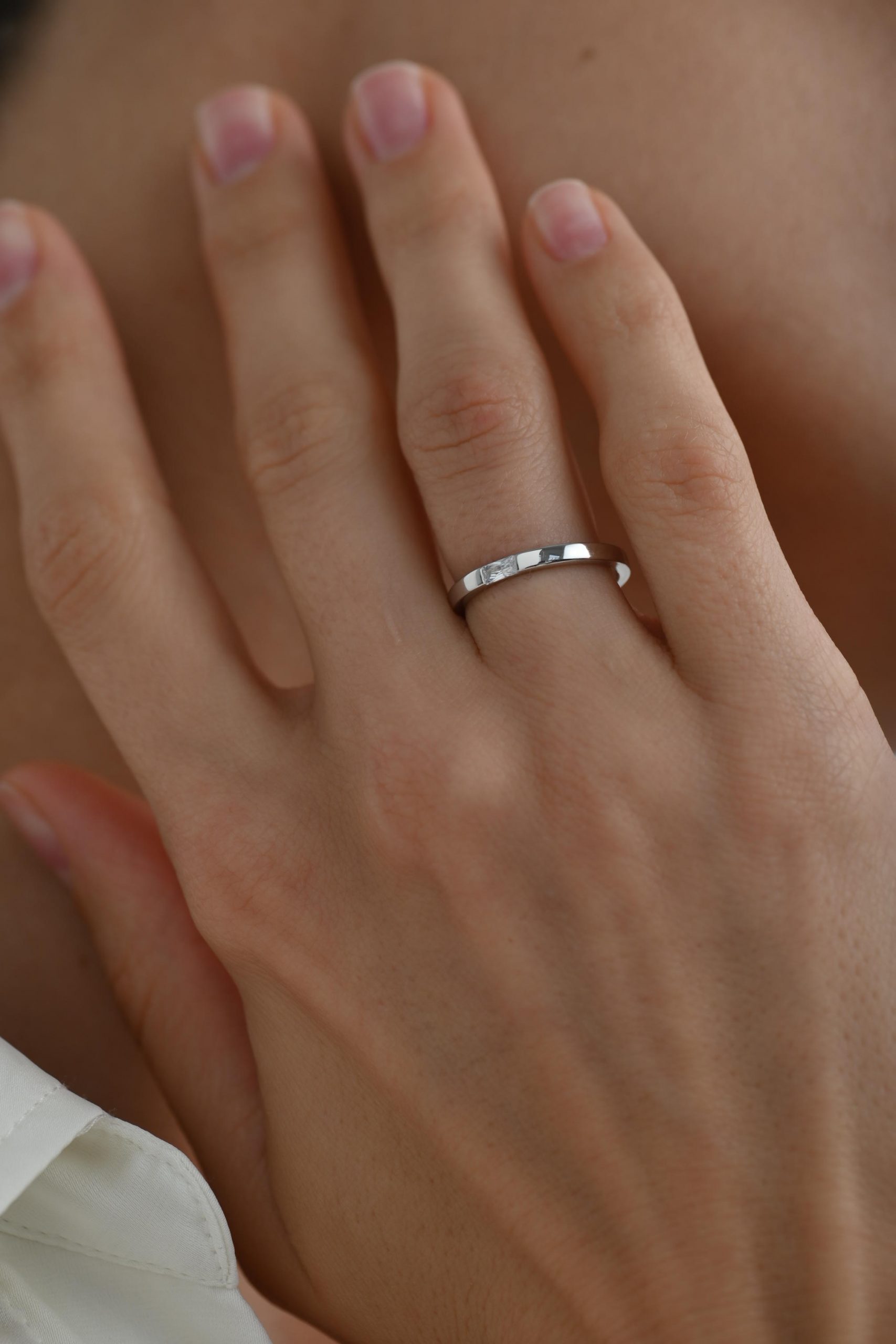 Нежная и современная интерпретация традиционного символа любви. В центре — бриллиант огранки багет, утопленный в металл, что делает украшение особенно удобным для повседневного ношения. Тонкое, аккуратное, оно выглядит легко и изящно, подчеркивая вашу индивидуальность.