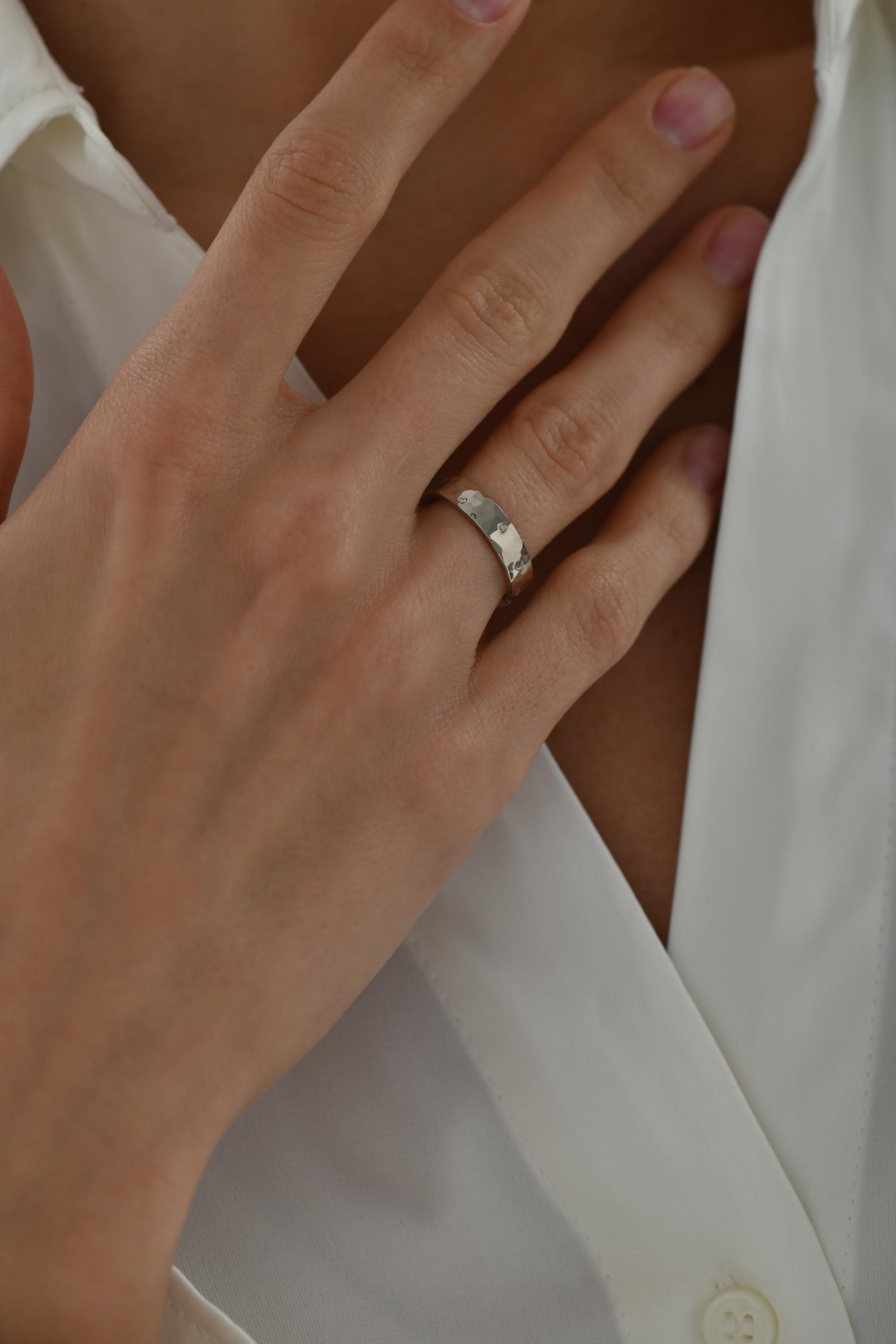 Кольцо с популярной фактурой, вдохновлённой поверхностью луны можно сделать по-настоящему уникальным — добавив россыпь бриллиантов. Небольшие, будто случайные звёзды на лунной поверхности, они придают кольцу сияние и особое настроение.