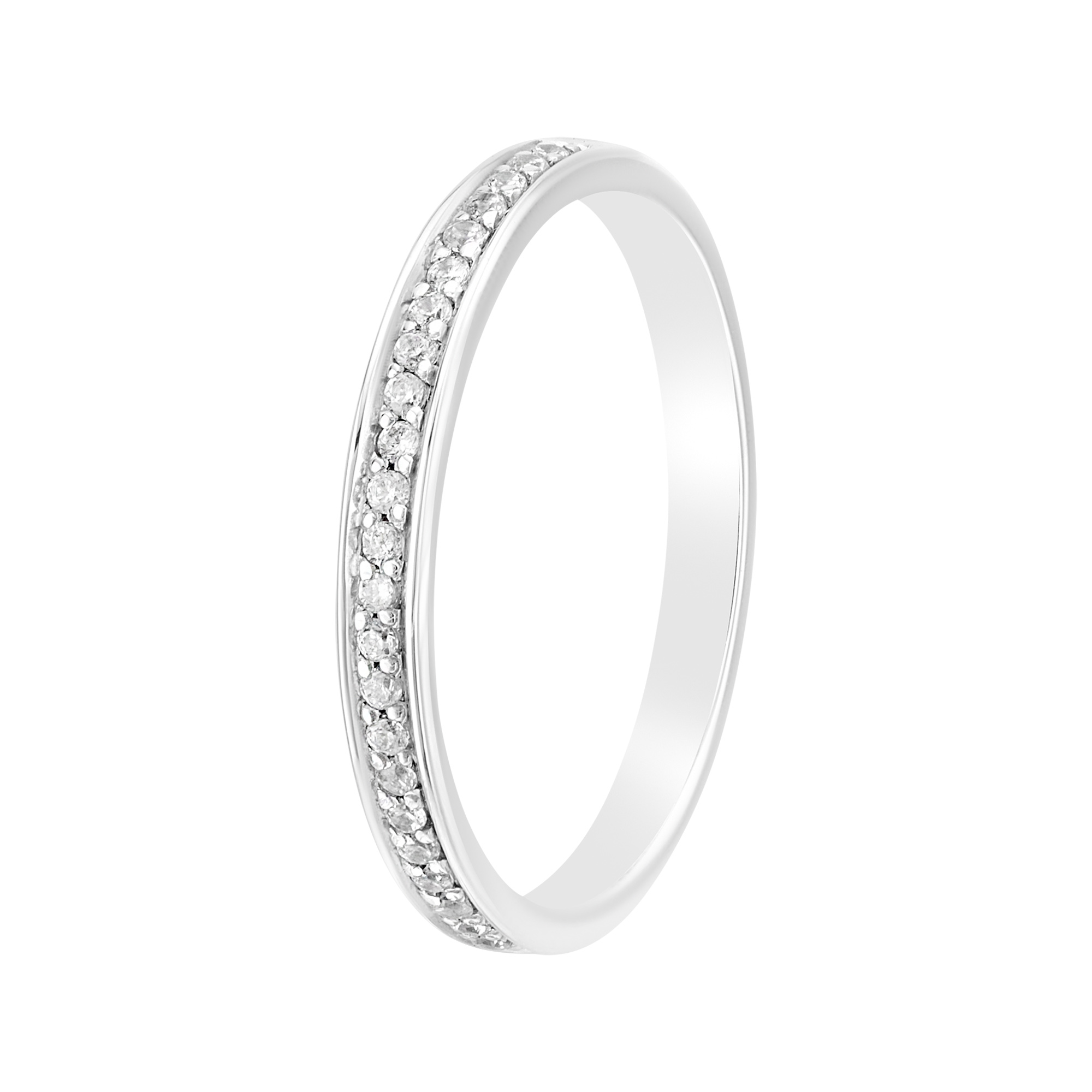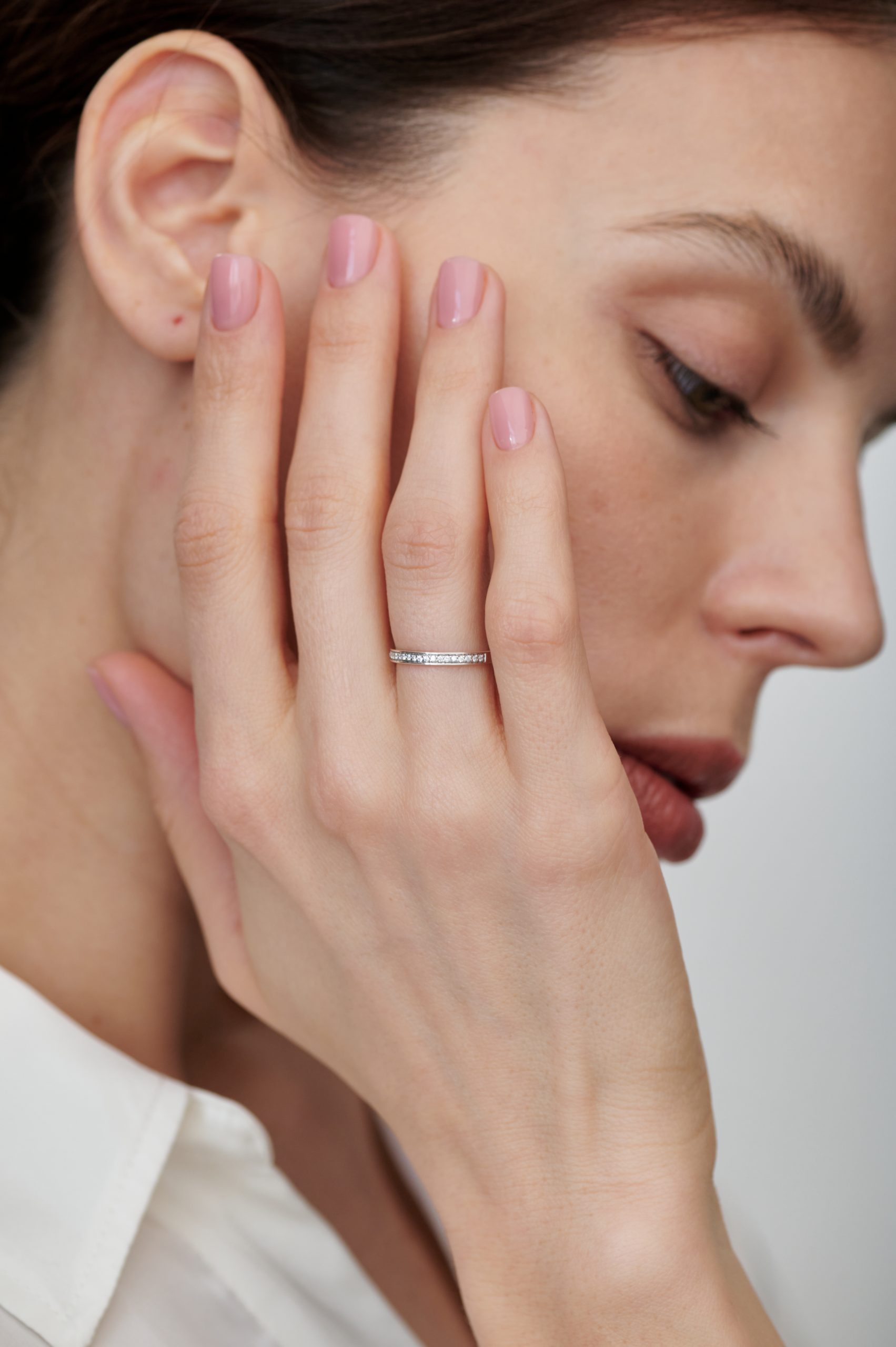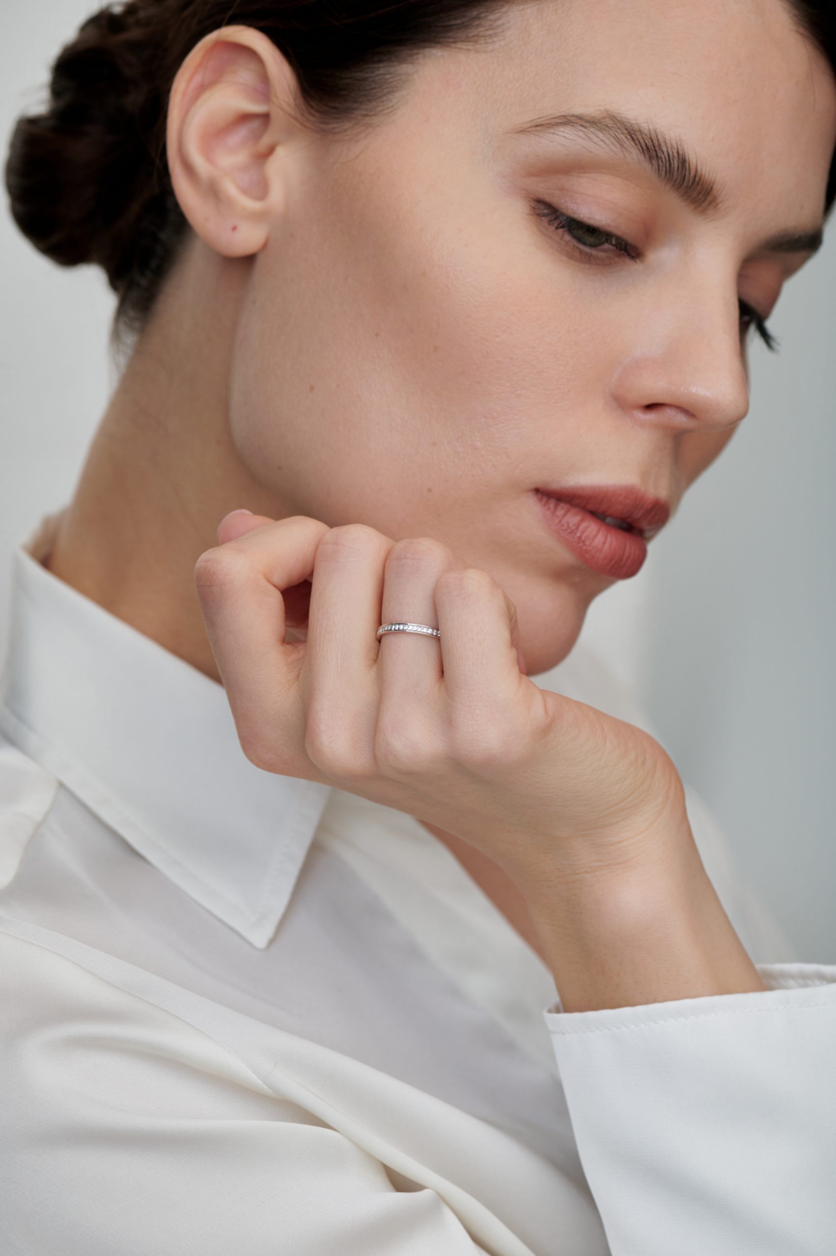 Тонкое кольцо с закрытой дорожкой бриллиантов — нежный и элегантный вариант обручального кольца. Аккуратно закреплённые камни создают мягкое, ровное сияние по всей поверхности, сохраняя при этом комфорт и практичность в носке.