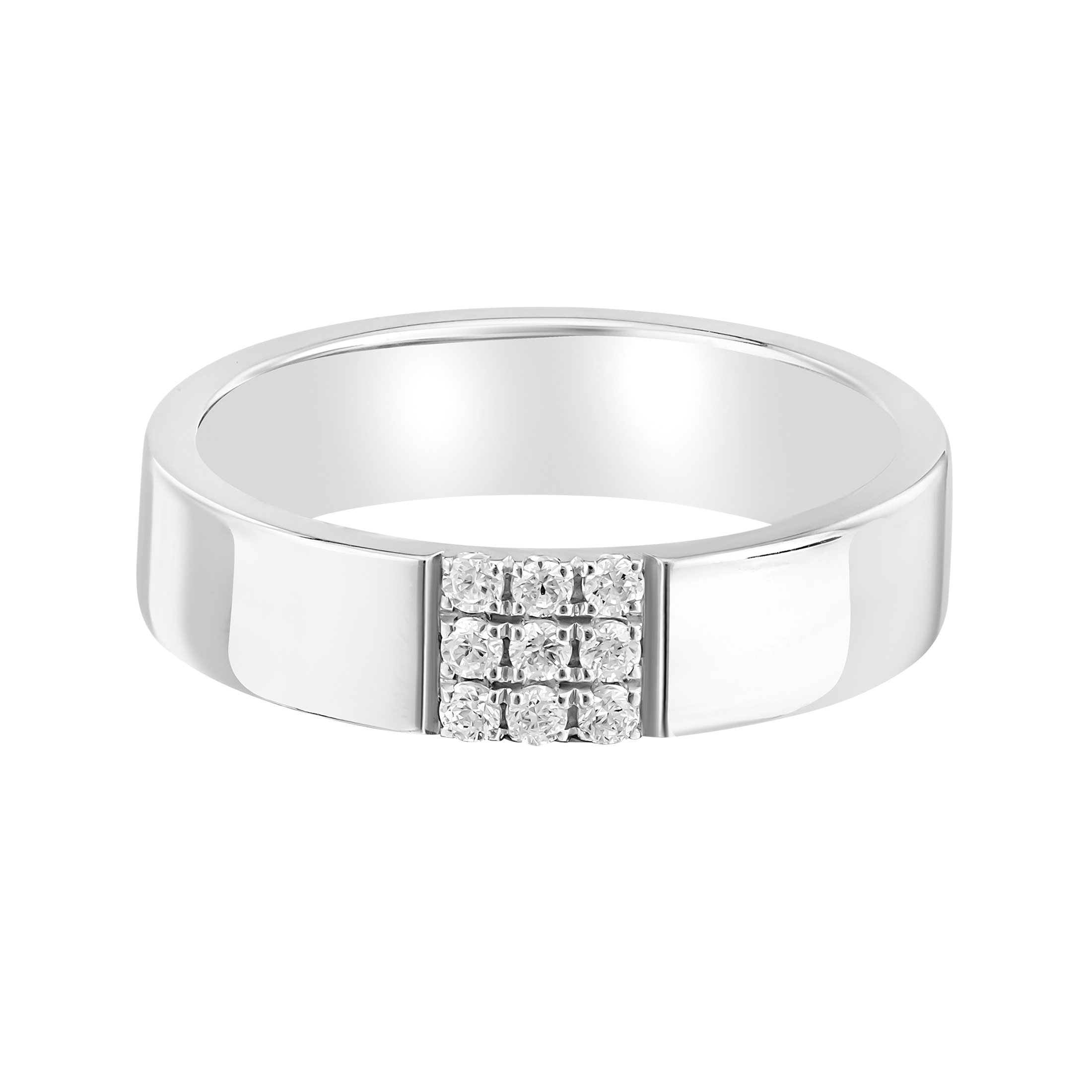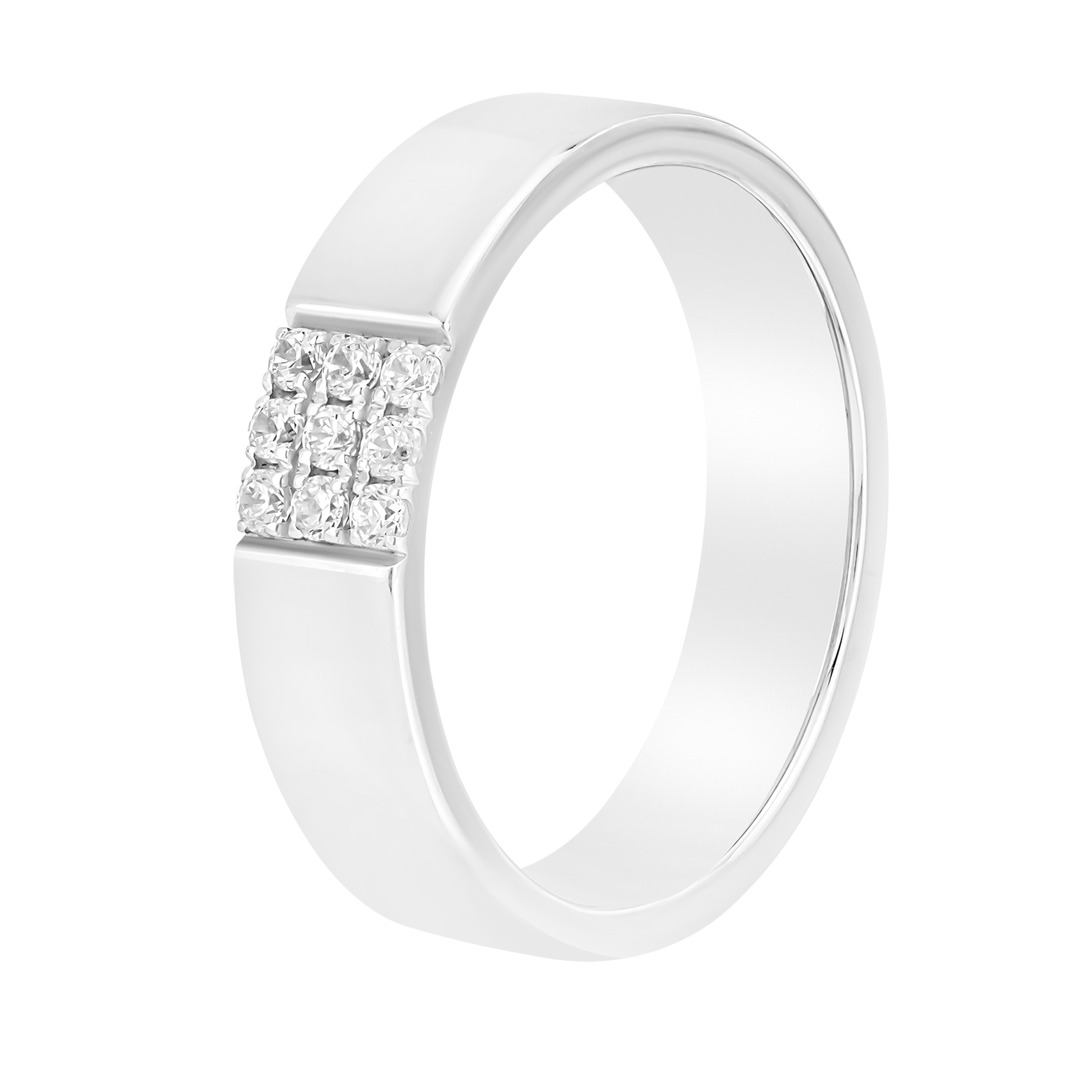 Современное обручальное кольцо с характером. Оригинальное кольцо с дорожкой из 9 бриллиантов, расположенных на широкой глянцевой шайбе, — необычное и стильное решение для тех, кто ищет что-то особенное. Яркий блеск полированной поверхности подчёркивает сияние камней, а нестандартное расположение и количество бриллиантов делает дизайн уникальным.