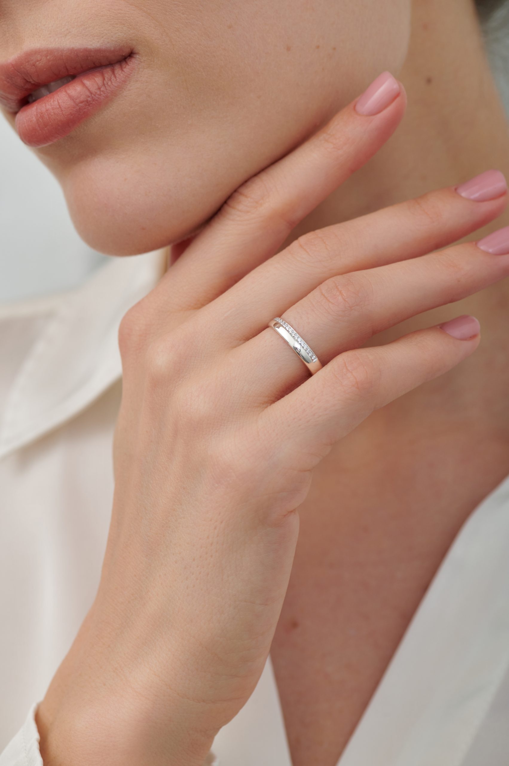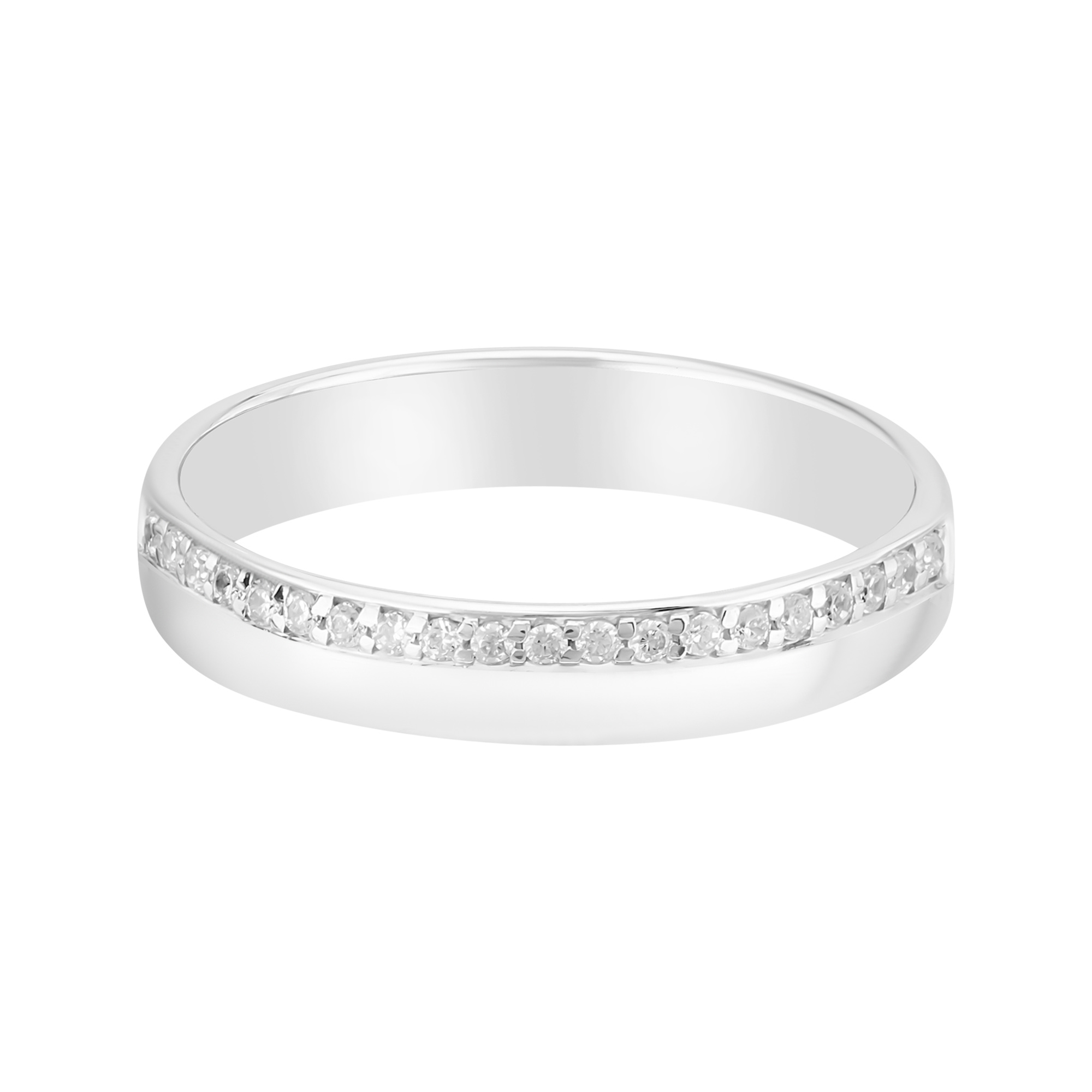 Мягкие линии кольца создают комфортное ощущение на пальце, а сияющая полоска камней добавляет лёгкое, но выразительное сияние. Такое кольцо — идеальный вариант для тех, кто ищет обручальное украшение с деликатной искрой
