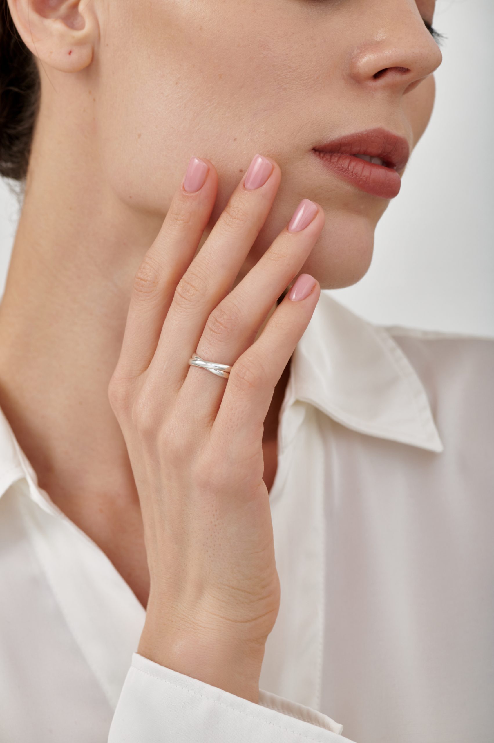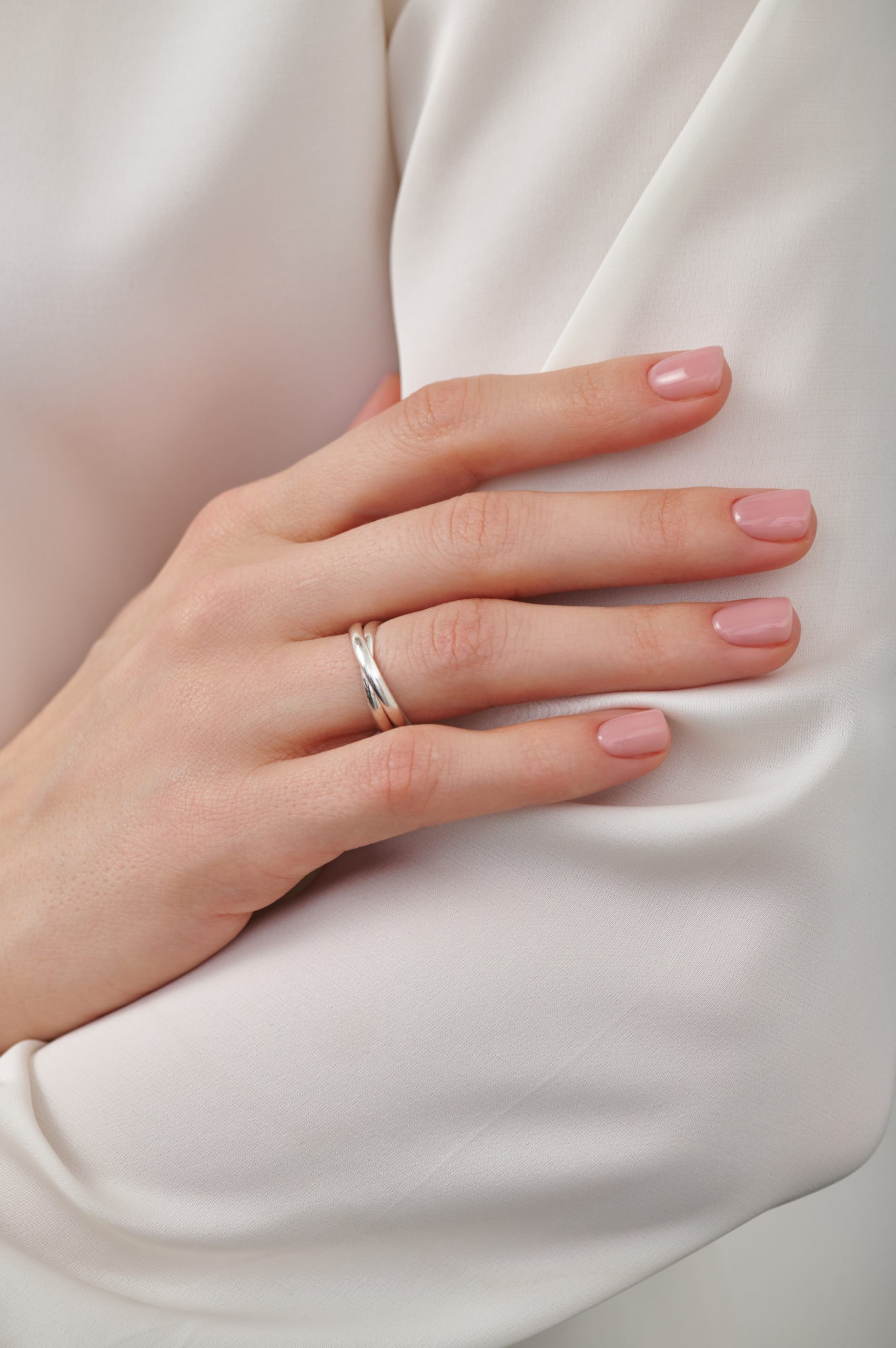 Двойное кольцо или кольцо-змейка состоит из двух тонких колец, соединённых между собой. Конструкция позволяет кольцам свободно двигаться, создавая лёгкий подвижный эффект при носке. Дизайн даёт возможность сочетать разные фактуры — например, матовую и полированную поверхность — или добавить бриллиантовую дорожку на одно из колец для акцента.