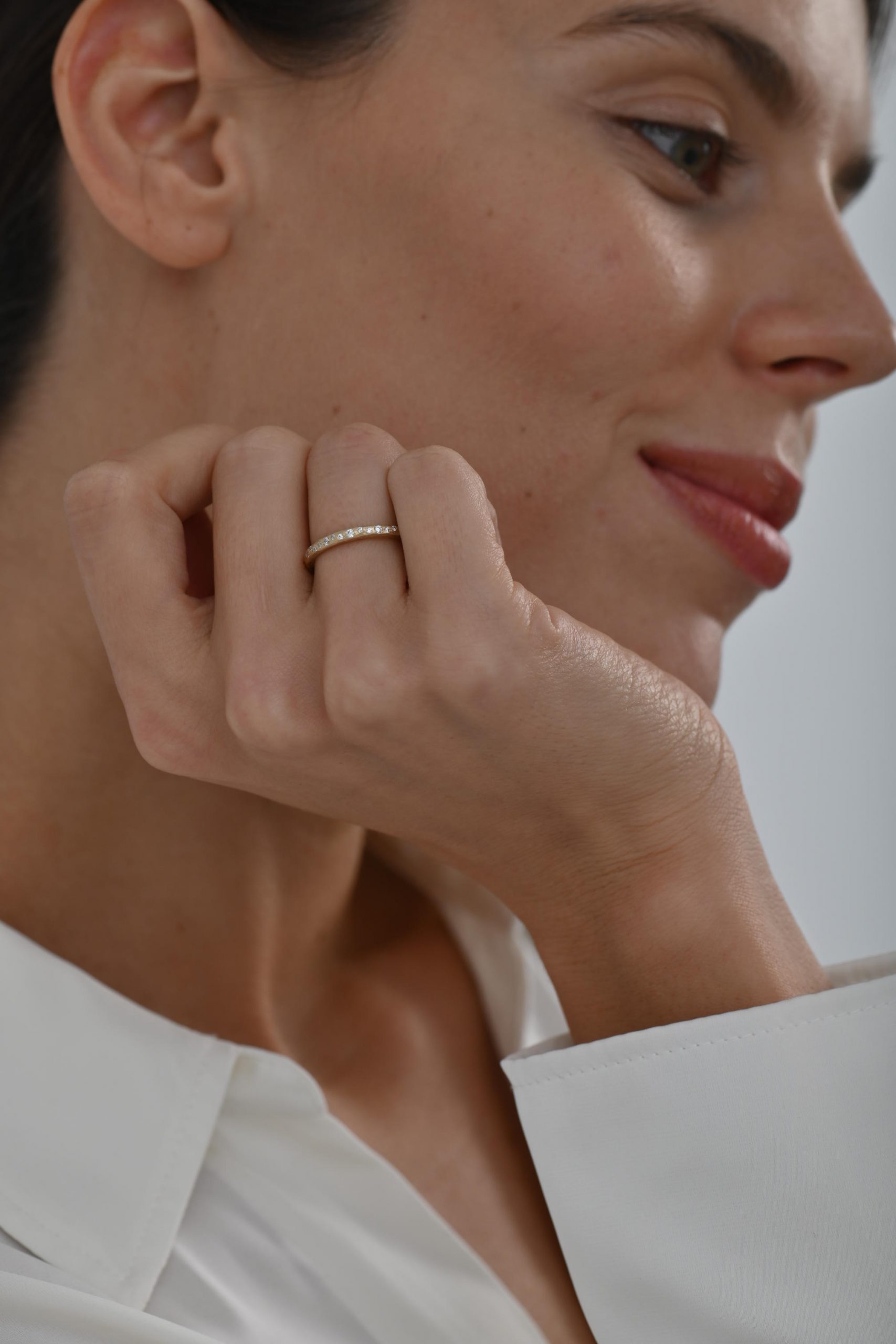Маленькое чудо на каждый день. Это кольцо стало частью нашей «»звёздной»» коллекции — тонкое, изящное и по-настоящему волшебное. Его поверхность украшена лунной фактурой, а россыпь мелких бриллиантов будто повторяет звёздное небо. Каждый камень сияет, как маленькая звезда, создавая ощущение, что вы носите с собой кусочек ночного неба.