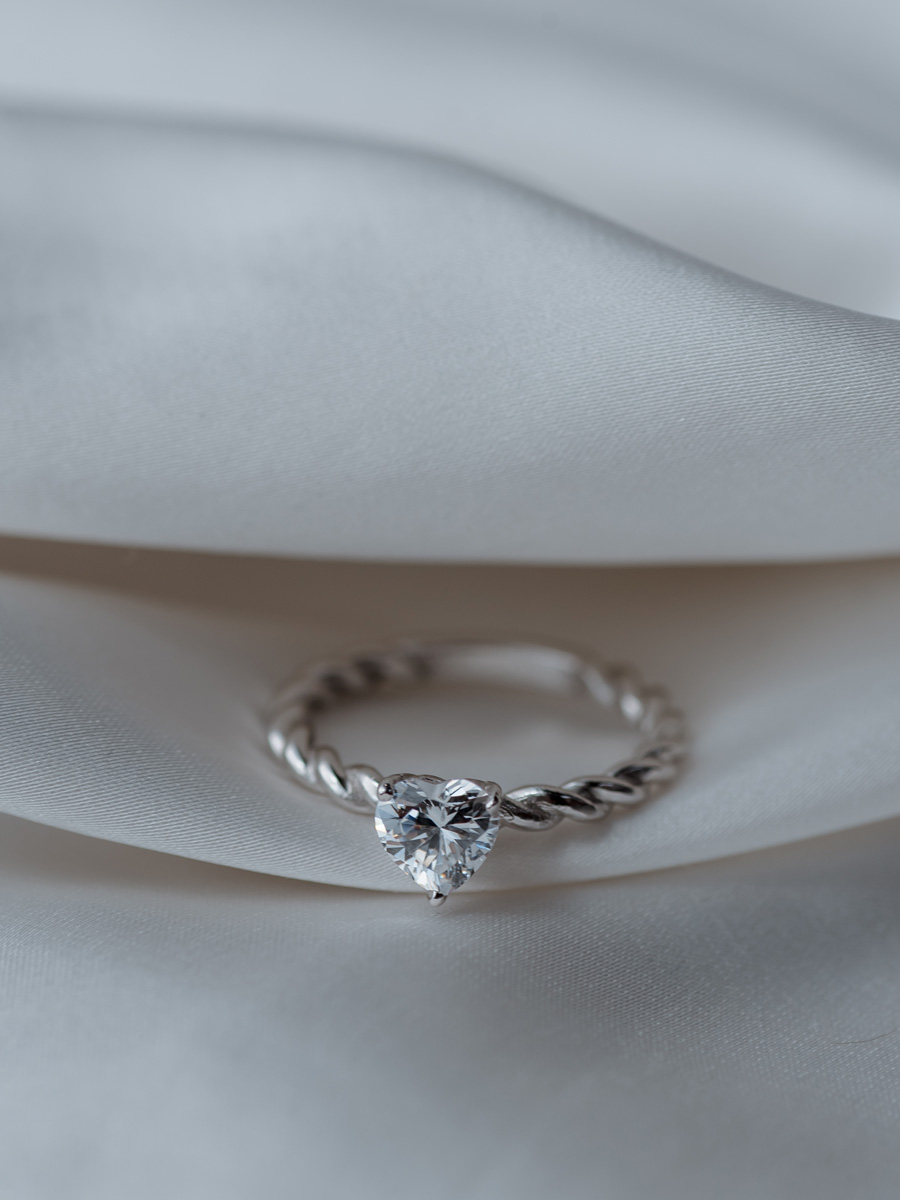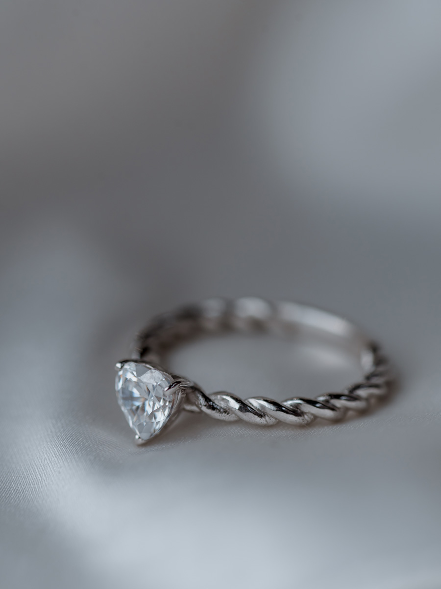 Помолвочное кольцо с камнем в форме сердце и оправой-переплетение