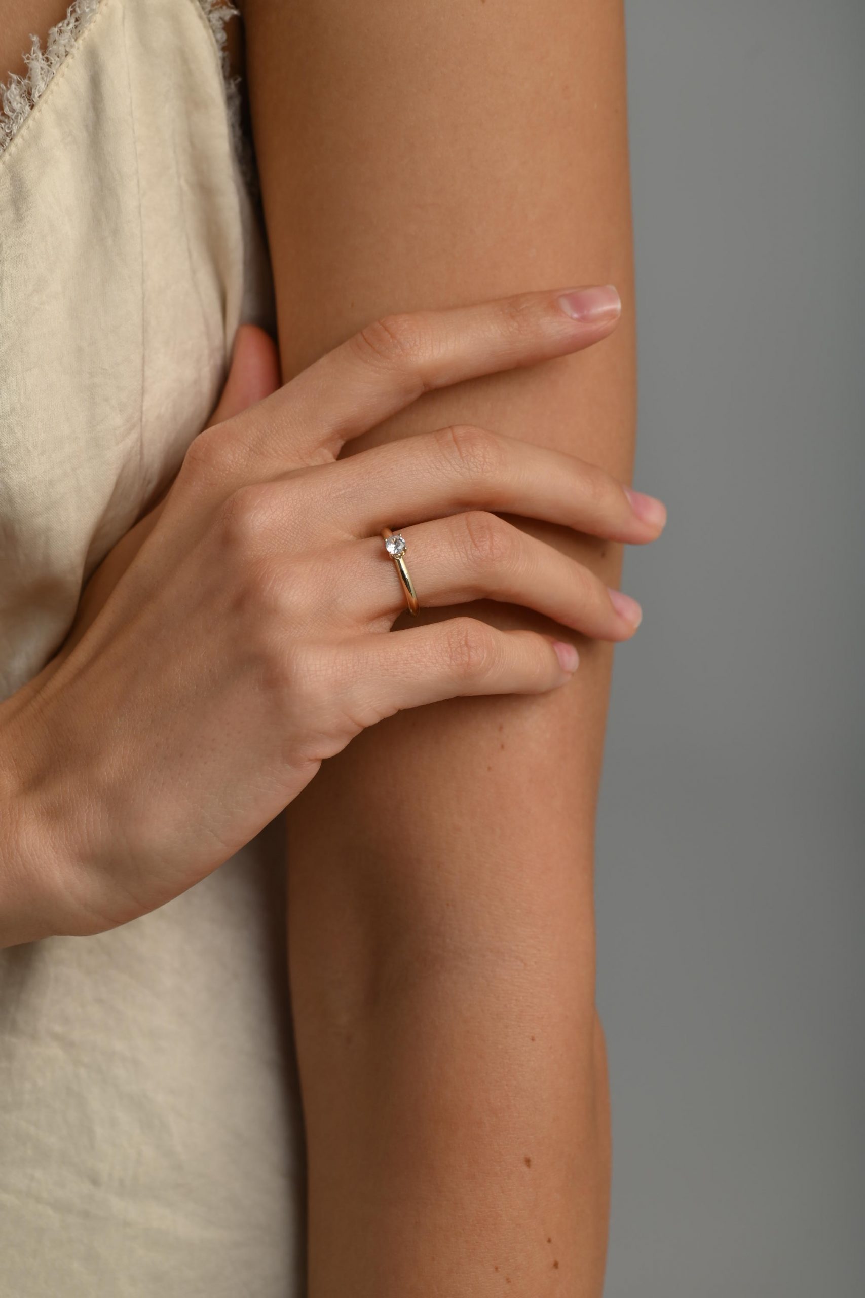 Помолвочное кольцо — с тёплым характером. Бриллиант в центре сияет ярко и чисто, а жёлтое золото придаёт украшению мягкое, солнечное настроение. Такой металл особенно нравится тем, кто любит тепло в деталях и немного винтажную эстетику.