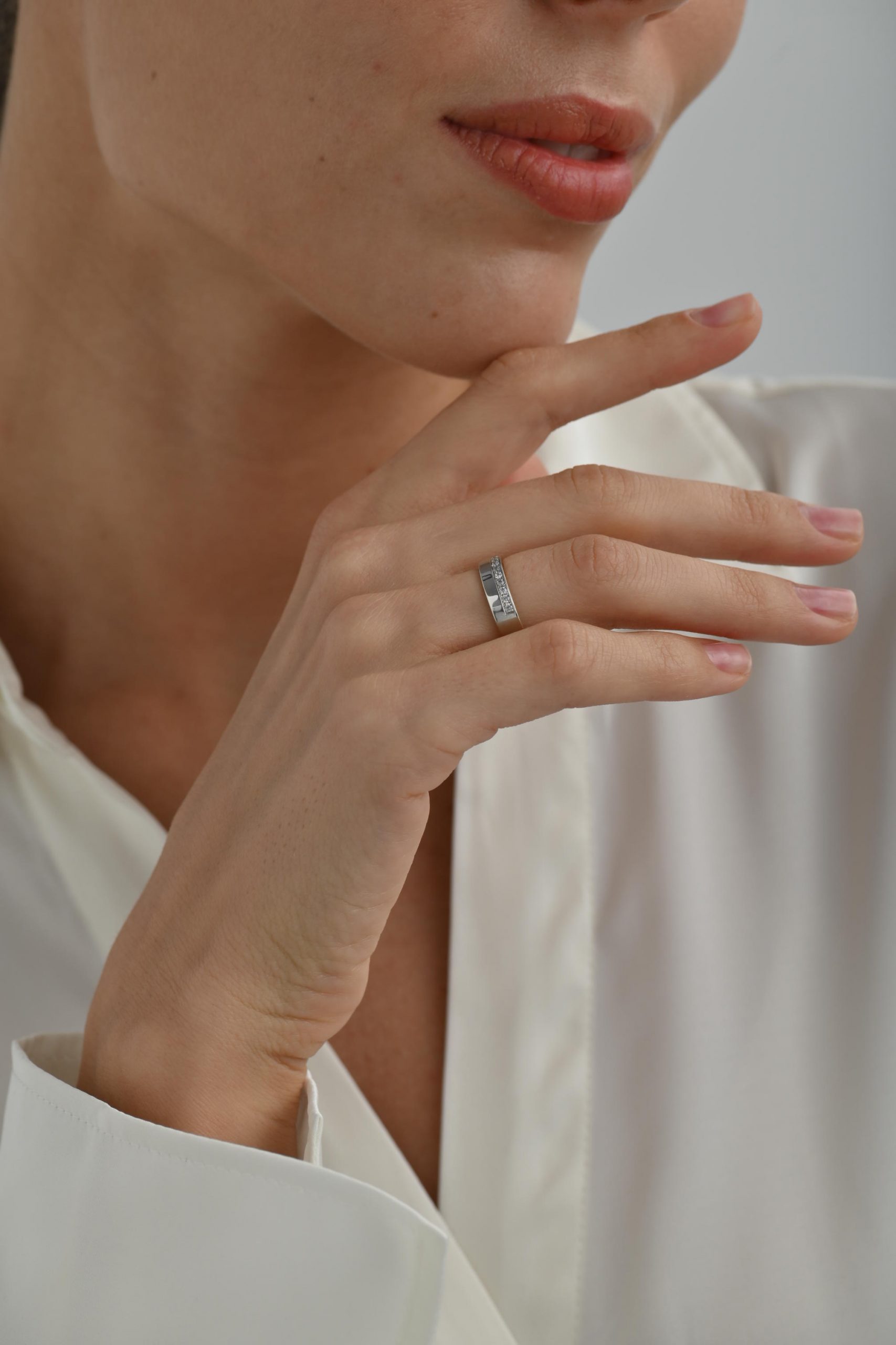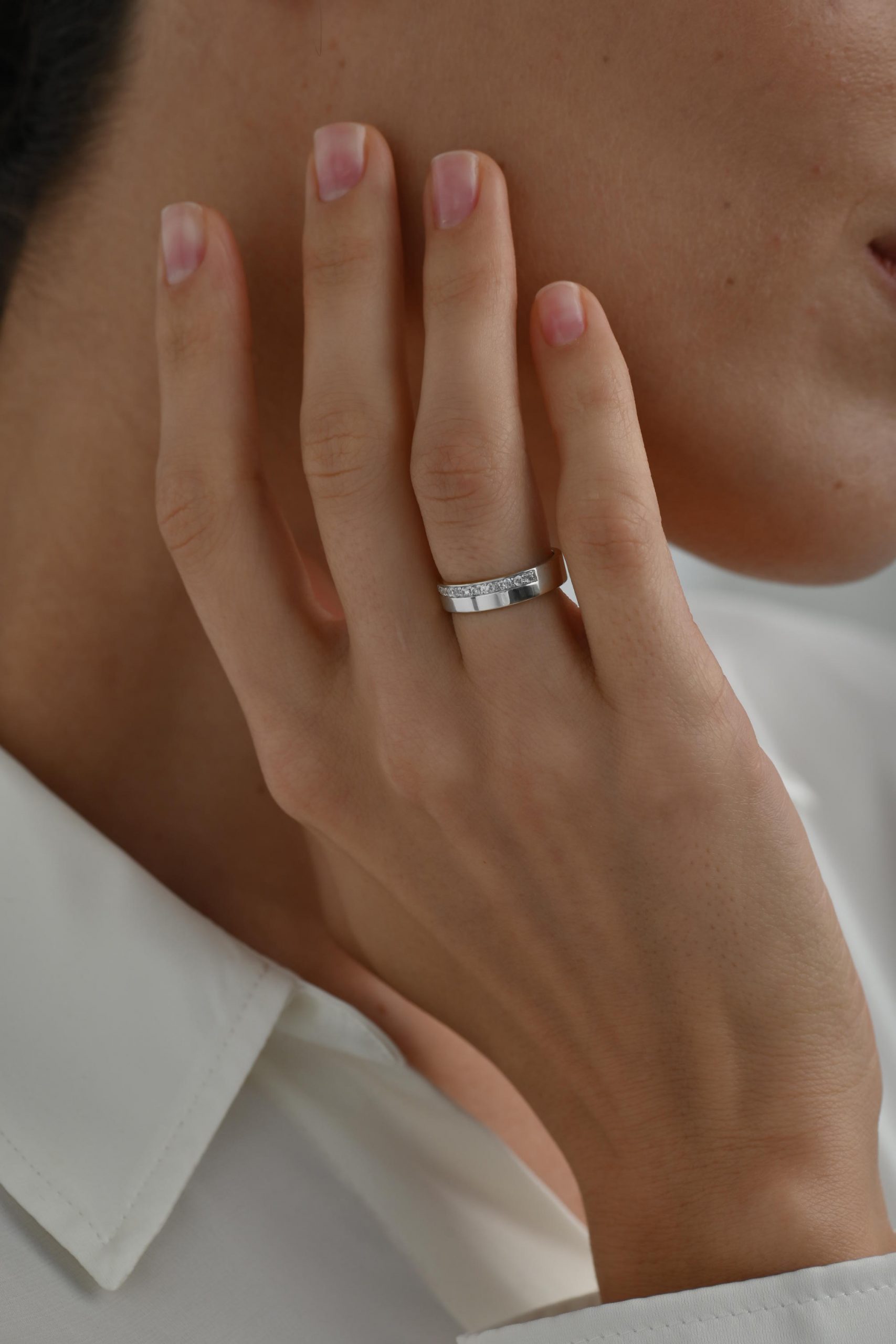 Выразительное и современное обручальное кольцо, которое сразу привлекает внимание. Чистые линии, уверенная форма и сияние камней сбоку создают тонкий, но эффектный акцент.