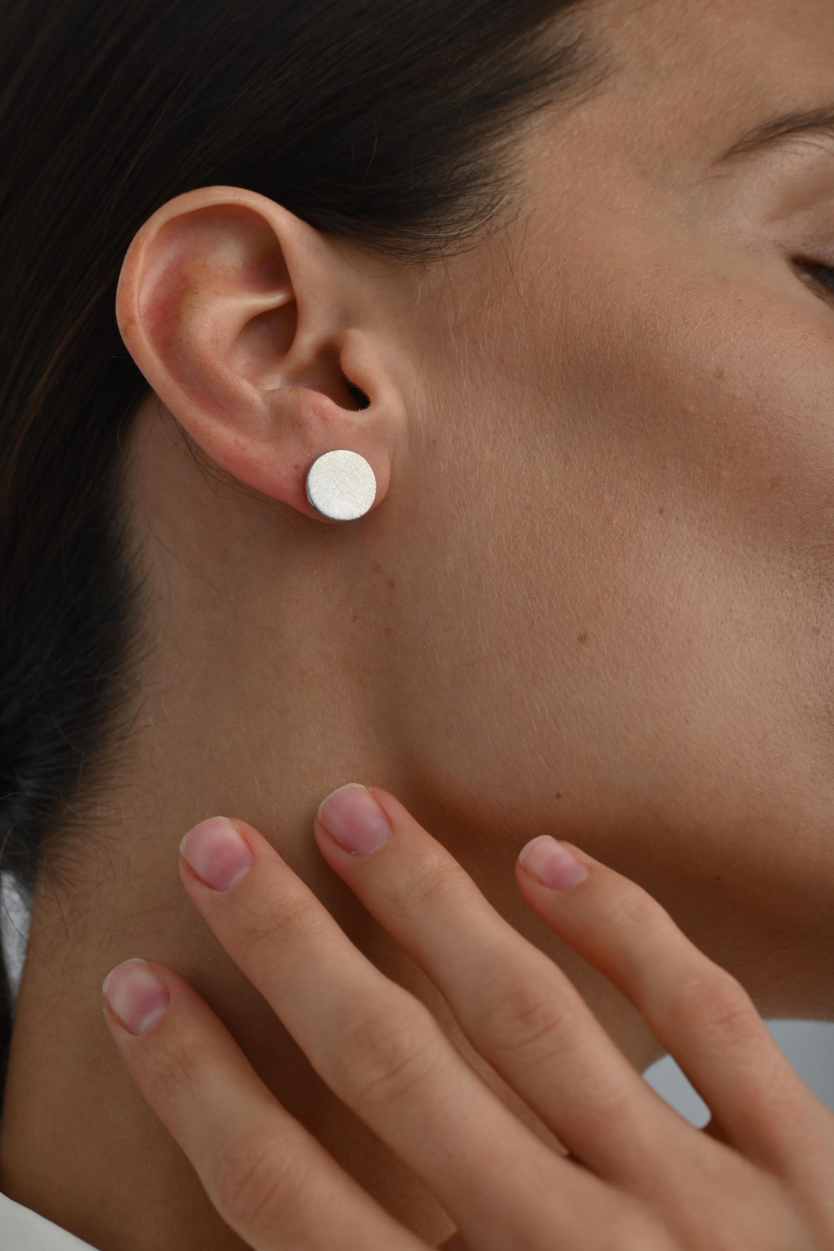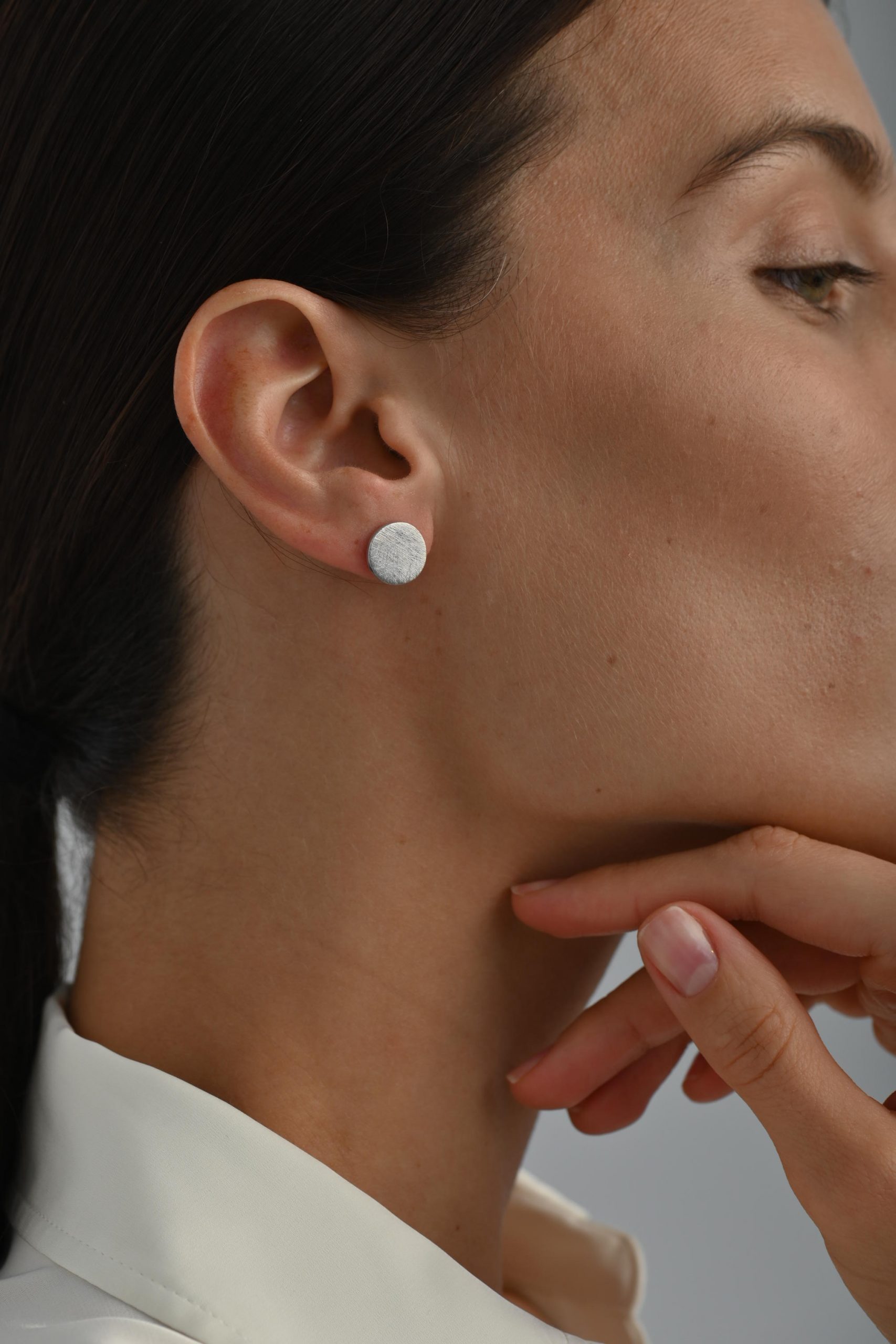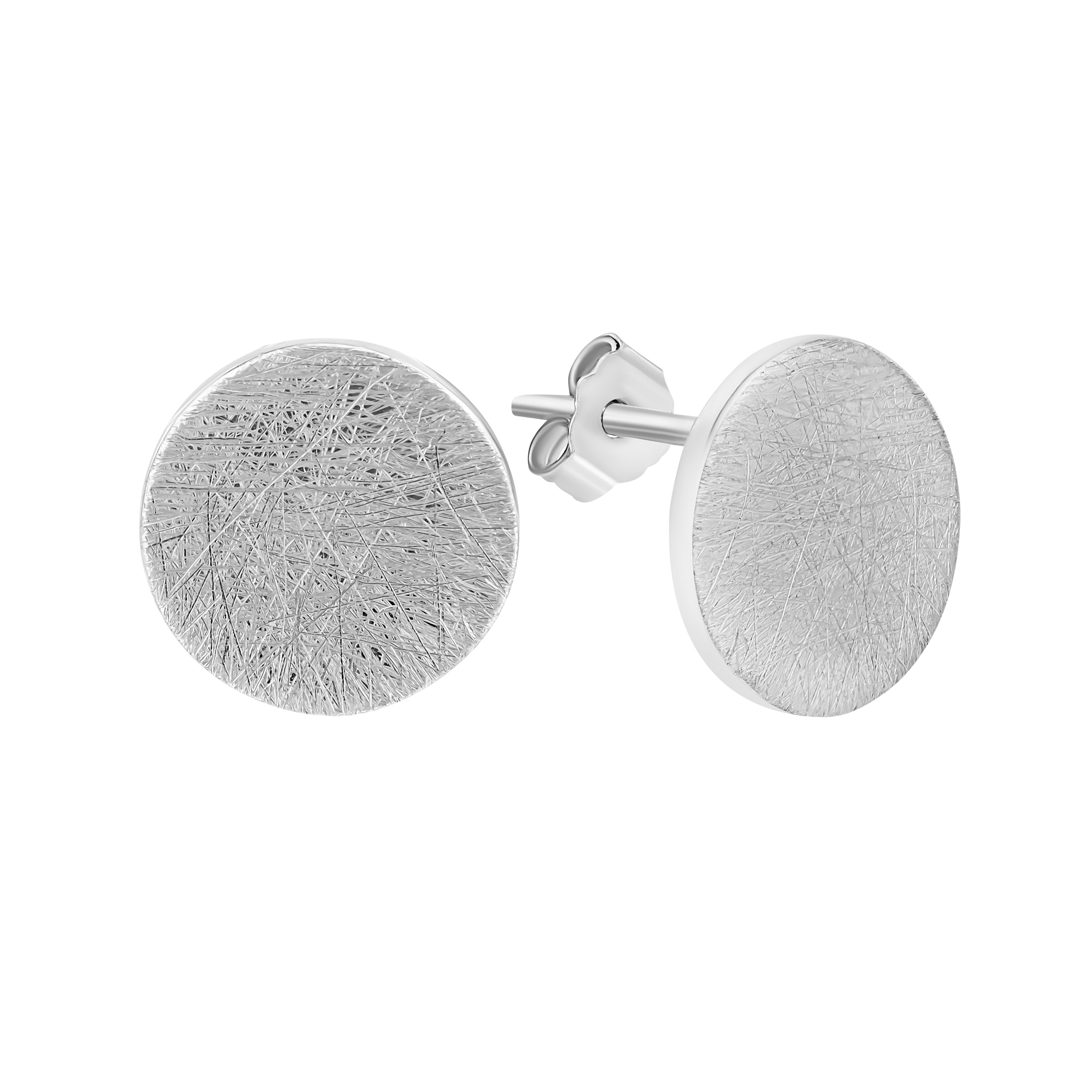 Выразительные серьги-пусеты. Их поверхность украшена фактурой «зимний лёд» — будто тонкие узоры на замёрзшем стекле, холодные и красивые. Они идеально сочетаются с обручальными кольцами в той же матовке, создавая гармоничный, продуманный образ.