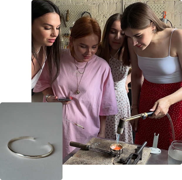 Мастер-класс длится 2-4 часа под руководством профессионального ювелира и проходит в несколько этапов: выбор дизайна изделий, подготовка материалов, плавка металла, прокатка, скручивание, пайка, шлифовка, нанесение дизайна и полировка.